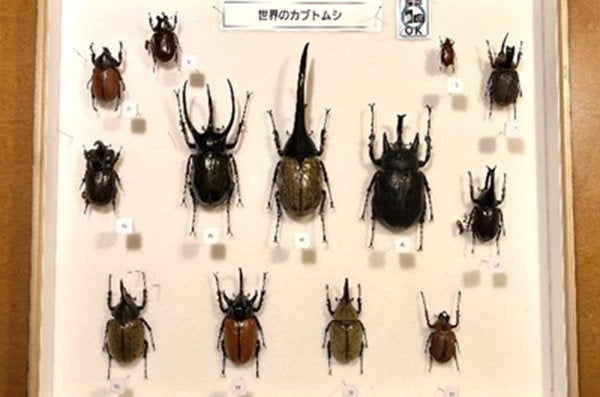 ヘラクレスオオカブトや、ファブリスノコギリクワガタなど、国内外の昆虫約15種を展示。