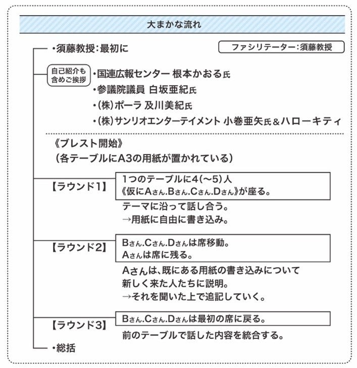 ■ブレスト参加者 ①APU 立命館アジア太平洋大学 ・サステイナビリティ観光学部 教授 須藤 智徳 (講義/ファシリテーター) ・サステイナビリティ観光学部の受講生(約200名) ②(株)サンリオエンターテイメント ハーモニーランド ・代表取締役社長 小巻亜矢 ・ハーモニーランドスタッフ(数名)と、ハローキティ ③大分県立情報科学高等学校 ・ 学校法人 扇城学園 東九州龍谷高等学校 ・各校在校生 (数名)・各校教諭、顧問 (数名) ④国連広報センター ・所長 根本かおる ⑤大分県 ・土木建築部(数名) ⑥日出町 ・日出町政策企画課(数名) ⑦(株)ポーラ ・代表取締役社長 及川美紀 ・ポーラ九州スタッフ(数名) ⑧(株)みょうばん湯の里 ・代表取締役 飯倉里美 ⑨トヨタカローラ大分(株) ・常務取締役、トヨタカローラ大分スタッフ(数名) ⑩ママのままプロジェクト ・代表 佐藤宝恵 ・ママアンバサダー(数名) ⑪参議院議員 ・大分県選出/自民党所属 白坂亜紀 ⑫大分女性議員ネットワーク ・日出町議会議員 河野美華 ・別府市議会議員 日名子敦子 ・臼杵市議会議員 匹田久美子 (順不同/敬称略) |