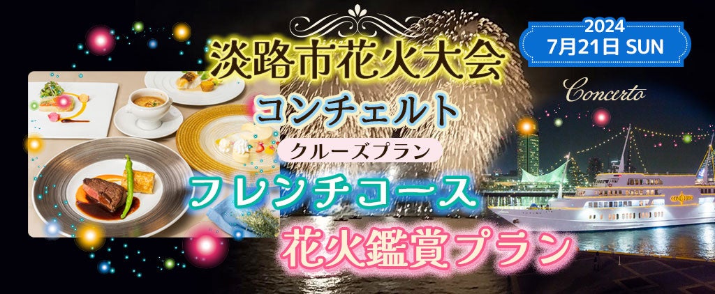 株式会社フォーティーズ(本社:大阪市鶴見区、代表取締役 岡武史)は、7月21日(日)限定お一人様¥23,000 淡路市の花火を船上でお楽しみいただく「淡路花火クルーズ」が今年も開催決定! コンチェルトクルーズプラン船上で花火を見よう!【フレンチコース】のオンライン予約を開始しました。