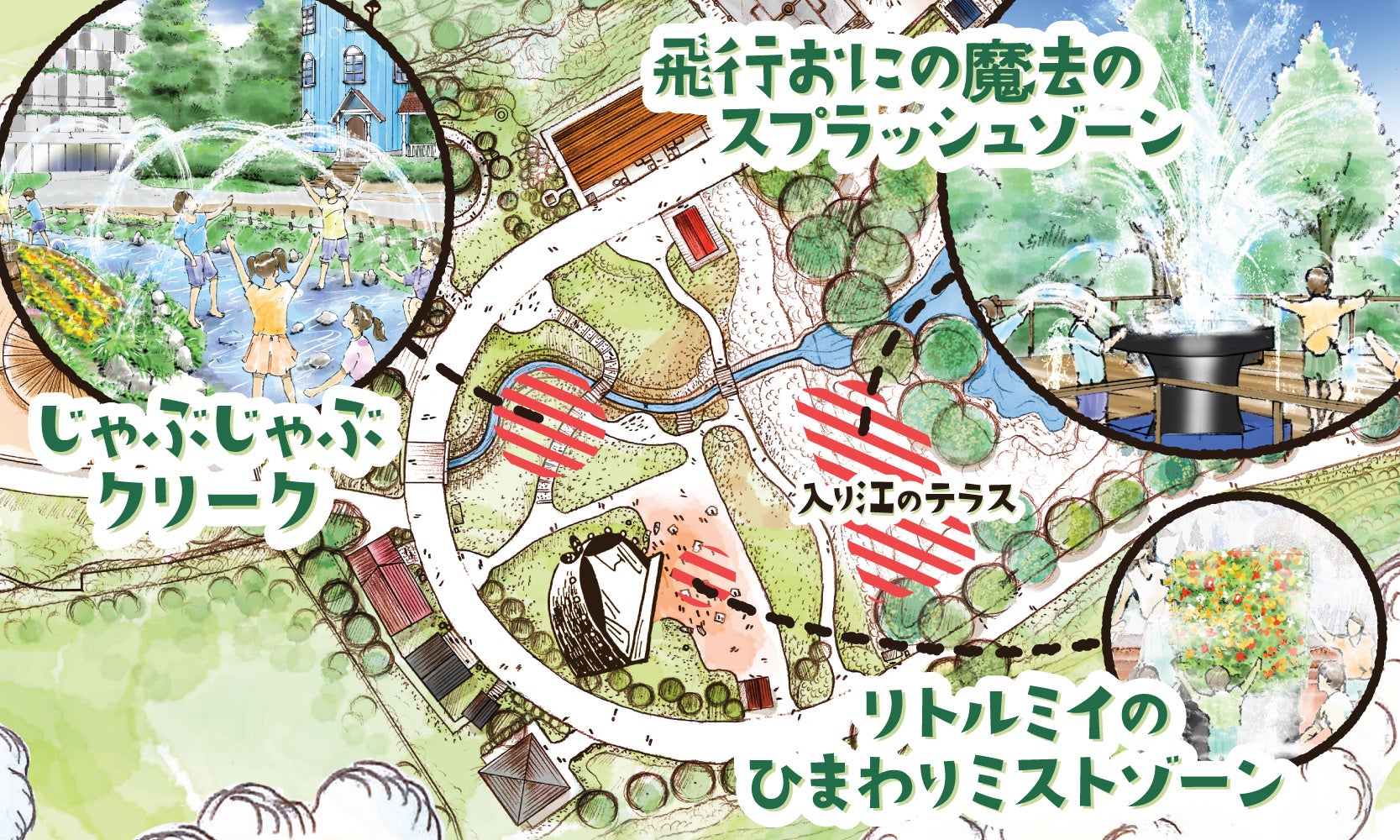 『入り江のテラス』とは、自然豊かな森と湖を背景に、 訪れる人々がムーミンの物語の世界を新たな視点で楽しむことができる、 豊かな自然と静寂な湖の景色に囲まれた心地よい場所です。 この夏はスプラッシュゾーンとしてみずあそびが楽しめ、 夏のイベント後には、ここでリラックスしたり、友人や家族との楽しい時間を過ごしたりと、 訪れるすべての皆さまに心癒される体験を提供いたします。 |