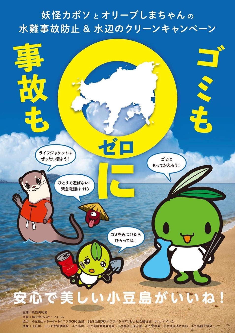 香川県・小豆島の「迷路のまち」(土庄本町)の妖怪美術館(小豆島ヘルシーランド株式会社)は、夏のレジャーシーズン最盛期に向けて、水難事故防止と美しい水辺環境の保全を啓発するキャンペーンを7月7日からスタートします。全島民のみならず来島する観光客にも訴求できるよう、泳ぎが得意な妖怪カボソと小豆島で人気のキャラクターであるオリーブしまちゃんをポスターに起用。海のレジャーサービスや海ゴミ清掃を積極的に行なう団体や法人にも協力をいただき、啓発活動を推進してまいります。