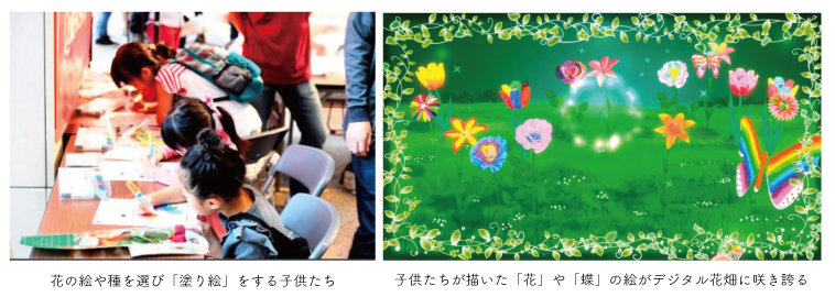 この体験型コンテンツでは、参加する子供達が好きなお花の塗り絵シートに自由に自分の色を描き、その描いた花をスキャナーで読み込むことで、デジタルのお花畑にツルが伸び、お花が咲くという体験が楽しめます。
