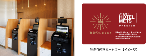 セルフチェックイン機にてチェックイン手続きを行っていただいた方に、抽選で当たり付きルームキーが発行されます。当選した方には、ホテルメッツのプレミアブランドに宿泊できる無料宿泊券をその場でお渡しします。