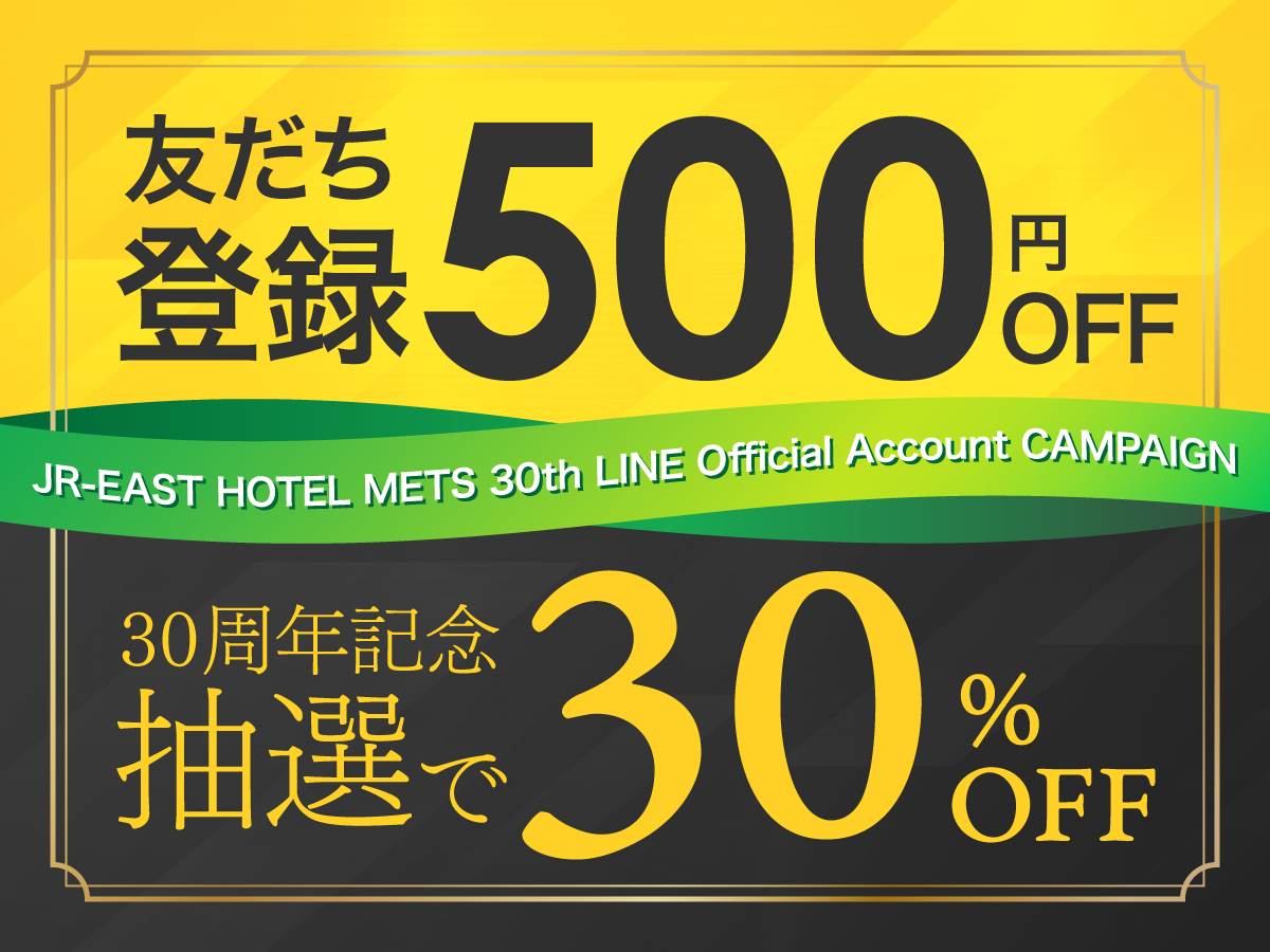 JR東日本ホテルメッツのLINE公式アカウントに新規友だち登録をした方を対象に、公式予約サイトでご利用いただける500円OFFクーポンをプレゼントいたします。また、2024年10月初旬に抽選で300名さまへ宿泊代金が30%OFFになるクーポンもプレゼントします。