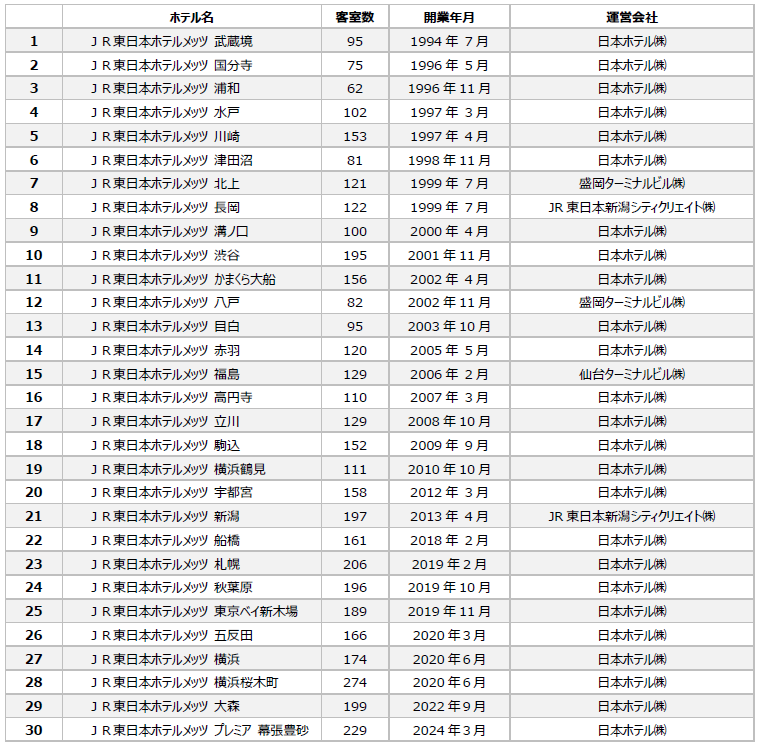 JR東日本ホテルメッツ 全30施設 客室数4339室(2024年6月21日現在)