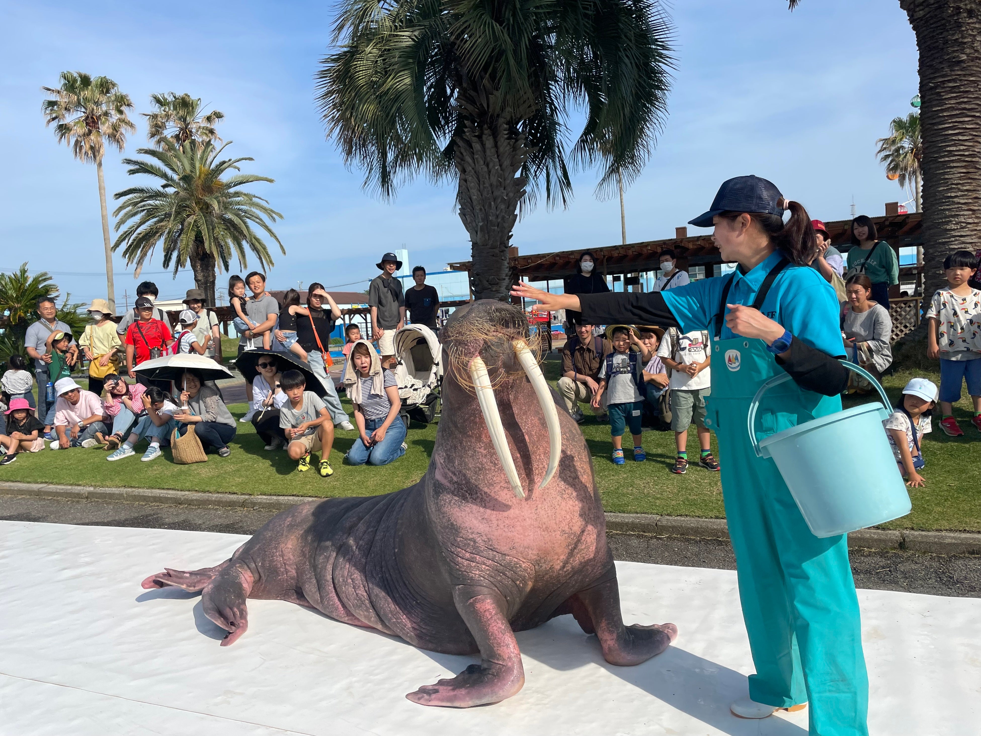飼育エリアから体重約1tのセイウチが屋外に出てきて、セイウチ館前の芝生エリアをスタッフと一緒に散歩します。その様子をお客さまはご覧いただくことができます。