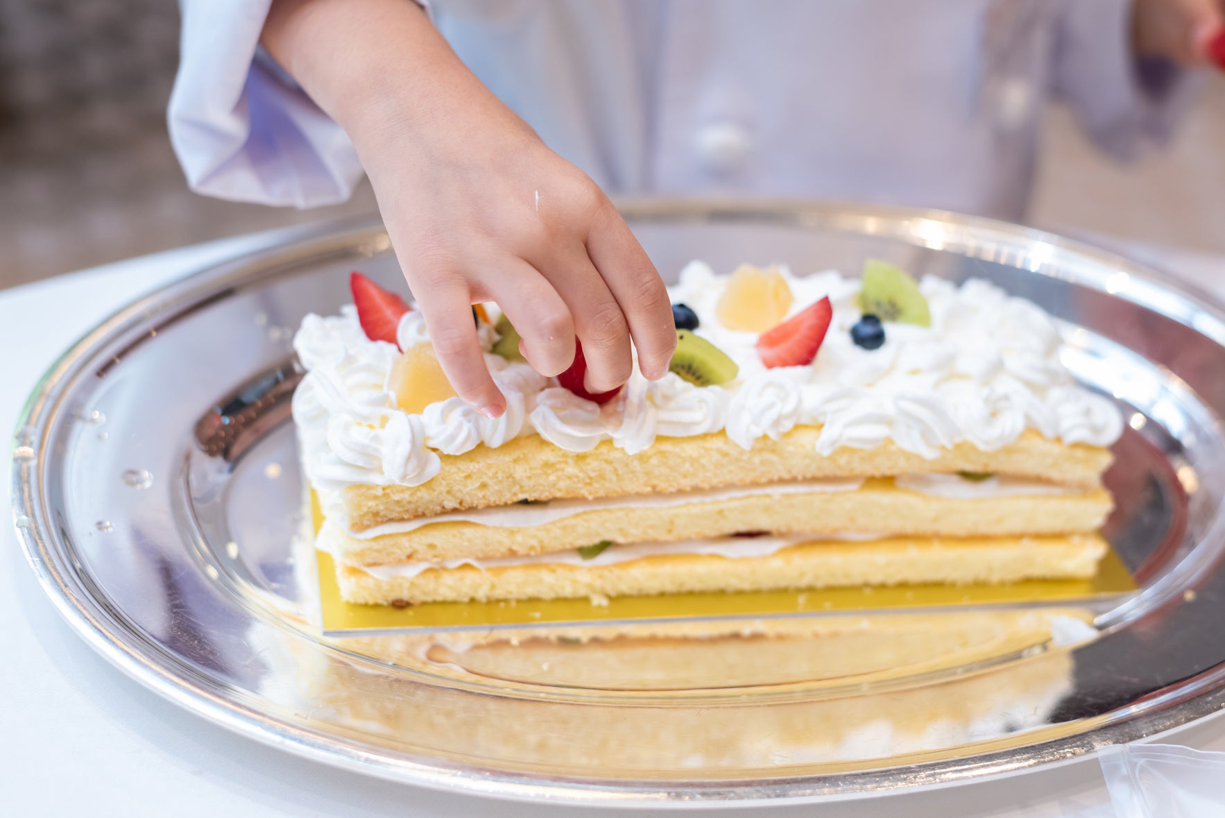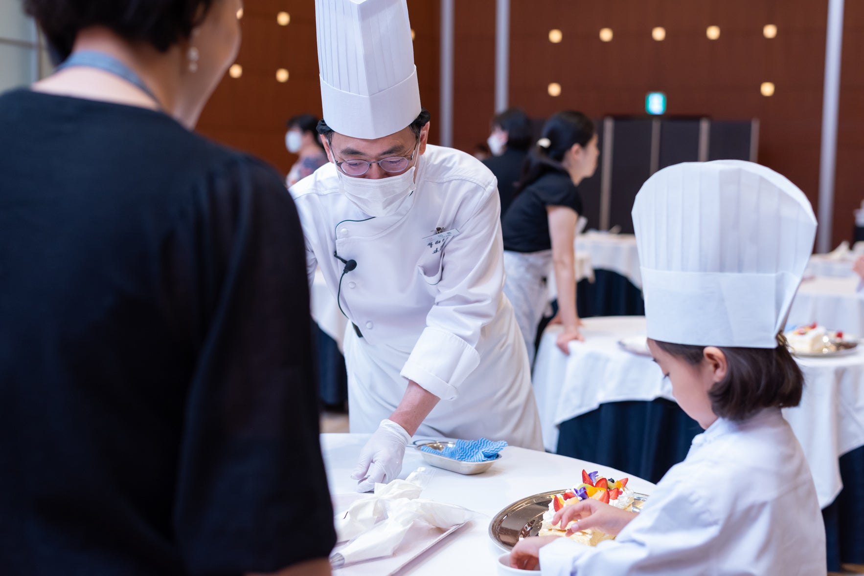 ご参加いただくお子様にはコックコートとコック帽をご着用のうえ、シェフ ド パティシエ 田島智指導のもとスポンジ生地を作る工程やデコレーションなどを体験しながら、フルーツショートケーキ作りにチャレンジしていただきます。お作りになったケーキはティータイムでお飲み物とともにお召し上がりいただきます。(お持ち帰りも可能)