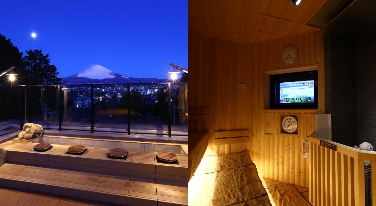 天然温泉 富士桜の湯「ドーミーインEXPRESS富士山御殿場」。富士山を正面に望む足湯にバーベキューエリア、遊びのスタイルに合わせたコンセプトルームを備えます。