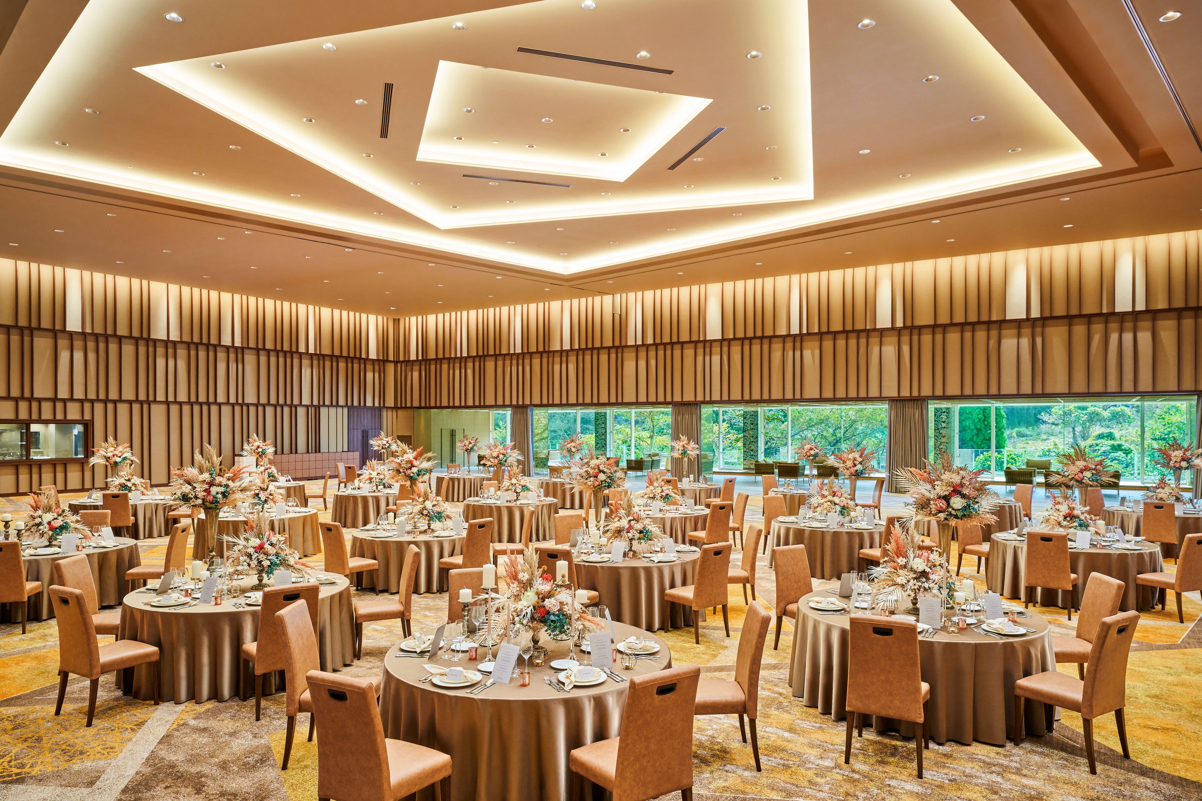 ・最大500名まで着席可能な大空間。ライブ感あふれるオープンキッチンや400インチの大型LEDビジョンを併設。宿泊棟などから独立したプライベート感に満ちた会場で特別な一日をお過ごしください。