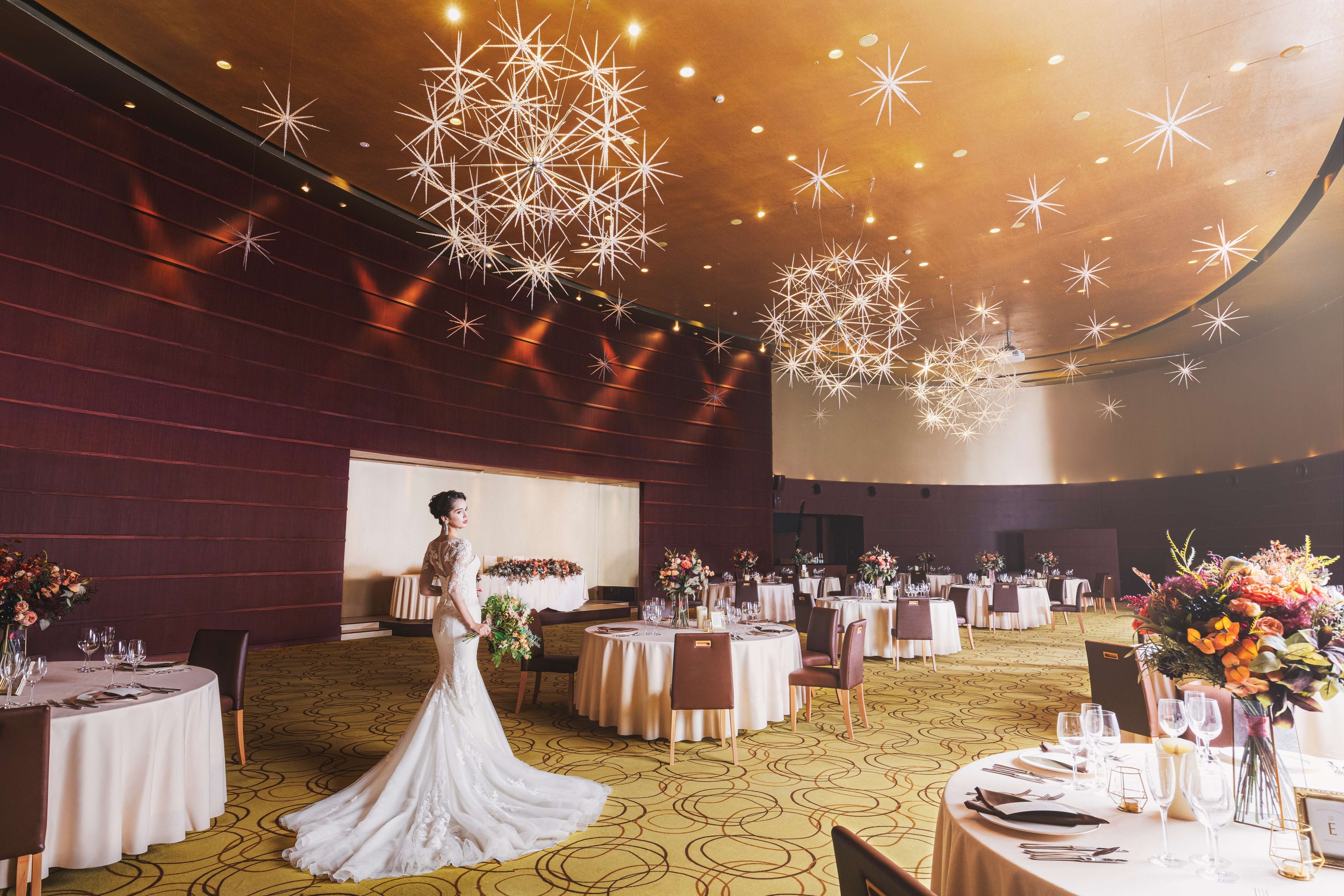 ・ゴールドとブラウンが融合したモダンで洗練された雰囲気の会場。天井高を活かしたスタイリッシュなシャンデリアと両面に巨大スクリーンを完備。ゲストの表情もしっかり見ることができます。