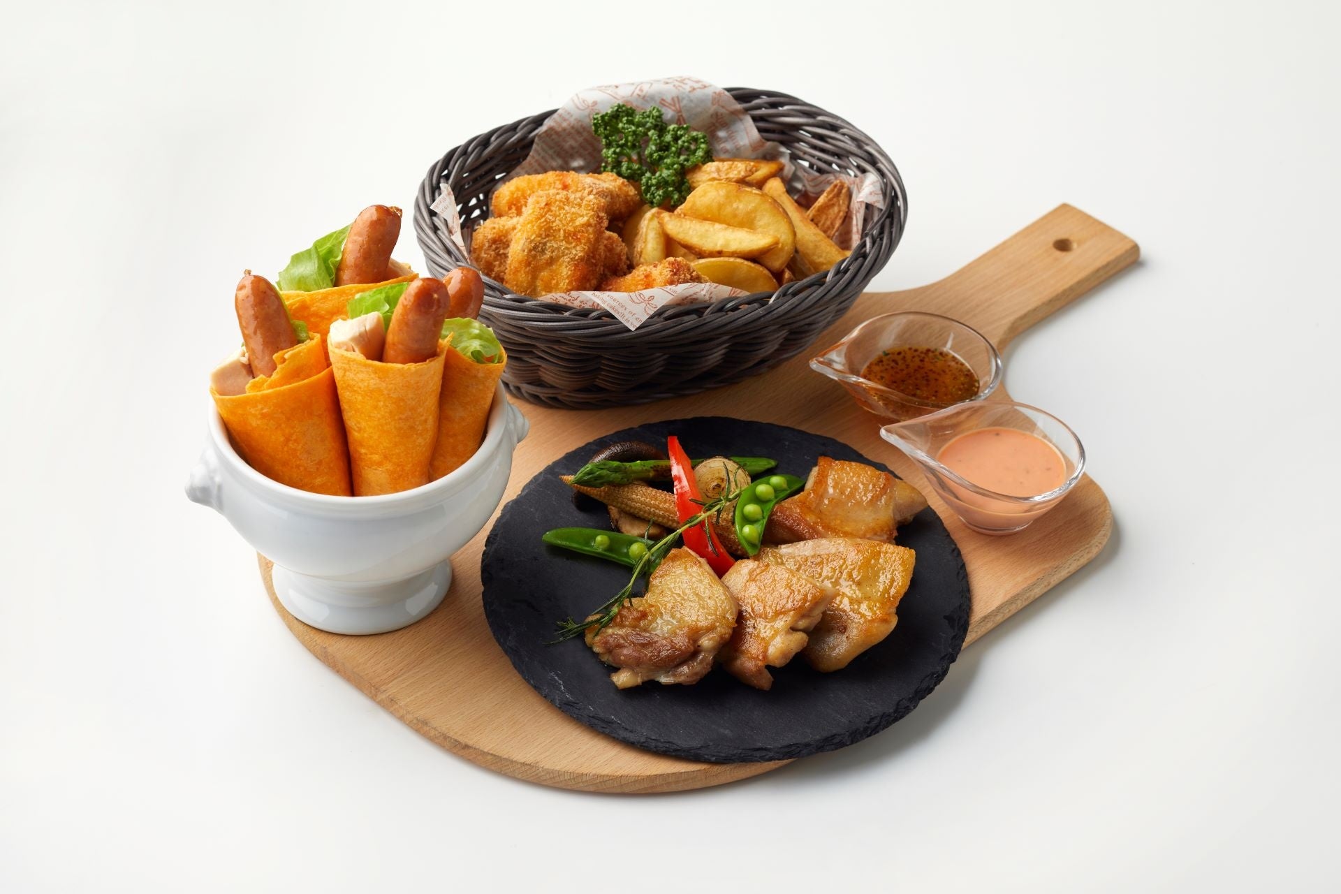 粗挽きソーセージのブリトー/チキンの塩麹マリネ ハニーマスタードソース