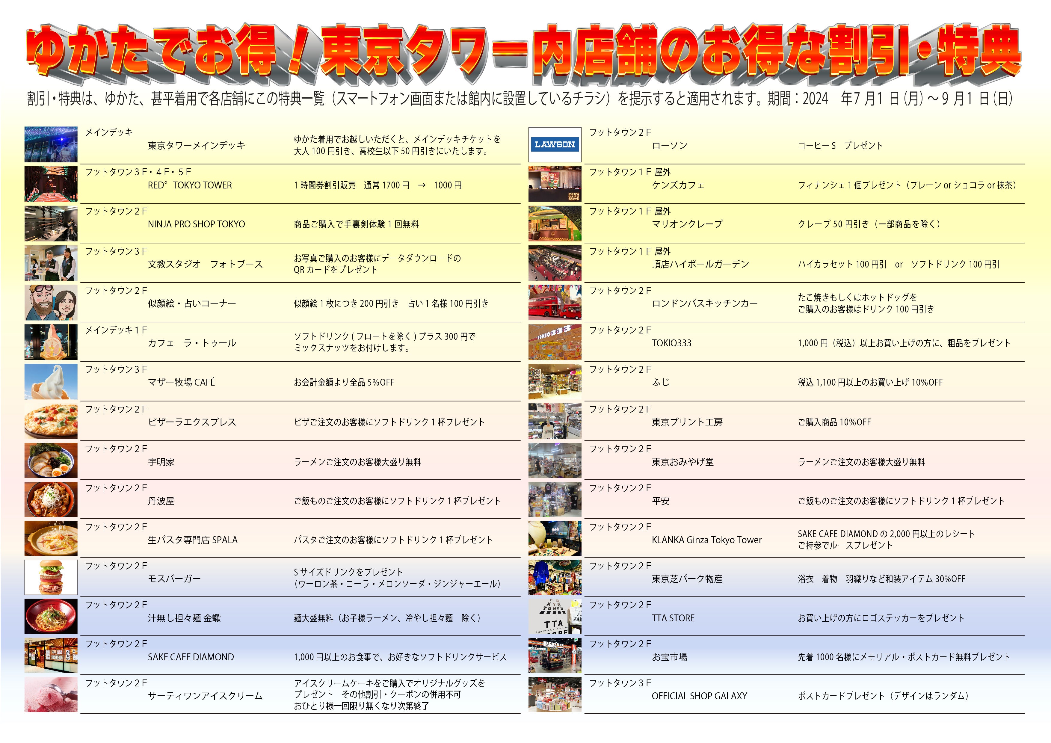 7月1日(月)~9月1日(日)の期間、東京タワーに浴衣や甚平着用でお越しになると、お得なサービスが受けられる夏の恒例企画「東京タワーだ!浴衣でお得!」を実施します。