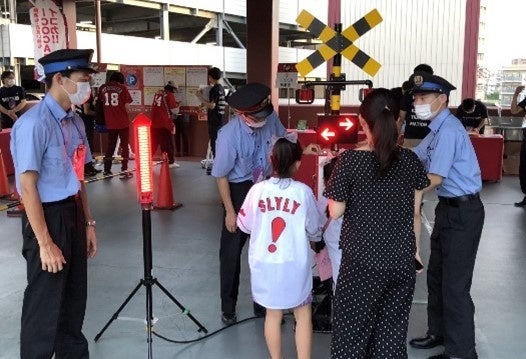 踏切内で異常があった際に、運転士に危険を知らせる踏切非常ボタンの使用方法を学べる「踏切非常ボタ