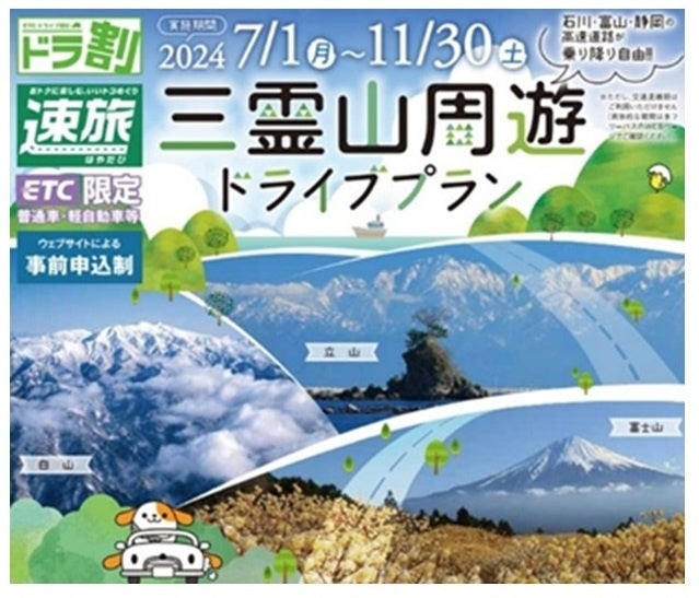 NEXCO中日本(本社・名古屋市中区、代表取締役社長CEO・小室俊二)は、日本三霊山誘客促進協議会(会長・竹沢 淳一)と連携して、2024年7月1日(月)~11月30日(土)の間、石川県、富山県、静岡県(以下、「三県」)内の高速道路が定額で乗り降り自由となるETC車限定の企画割引「三霊山周遊ドライブプラン」を発売します。