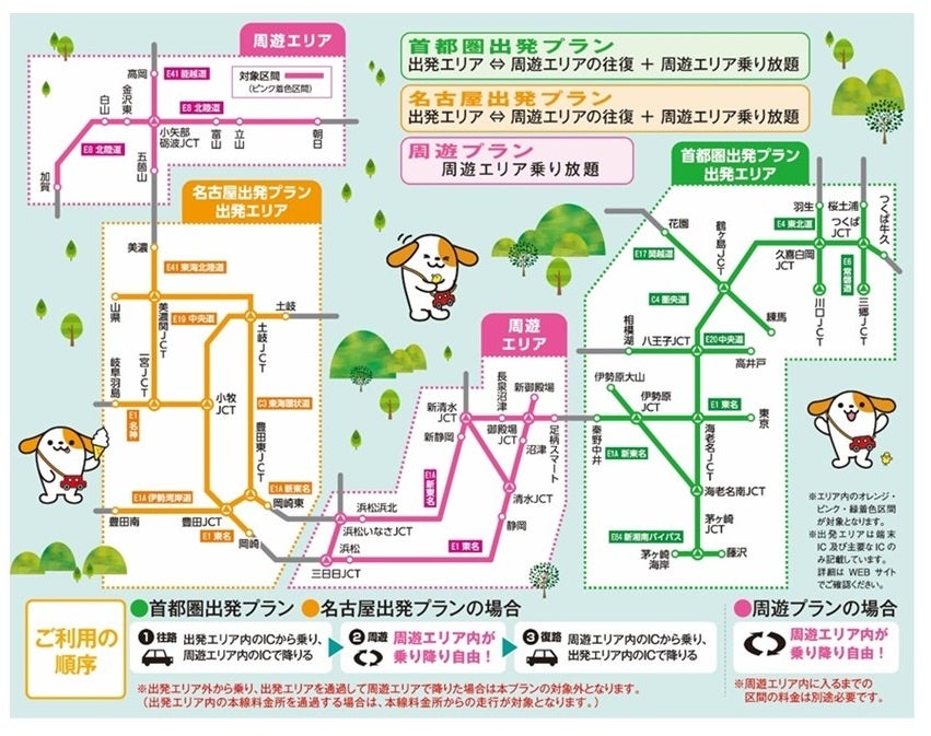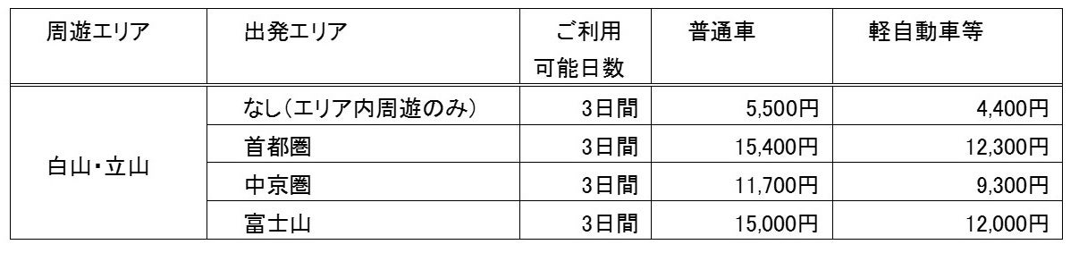 本プランは、古代より信仰の対象として人々から崇拝され、「日本三霊山」と称せられてきた「立山」、「白山」、「富士山」を擁する三県の観光振興と高速道路の利用促進を目的に実施するもので、多くのお客さまのニーズにお応えできるよう、「白山・立山エリア」、「富士山エリア」が乗り降り自由となる8つのプランをご用意しています。なお、首都圏出発のプランはNEXCO東日本協力のもと、NEXCO東日本管内のICもご利用いただけます。