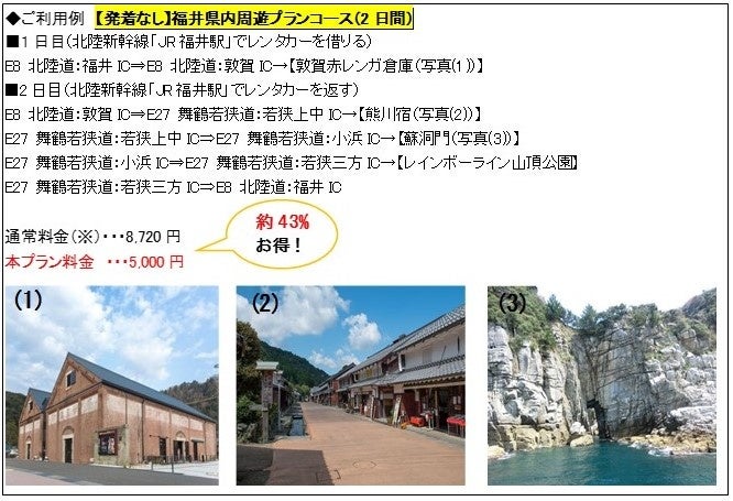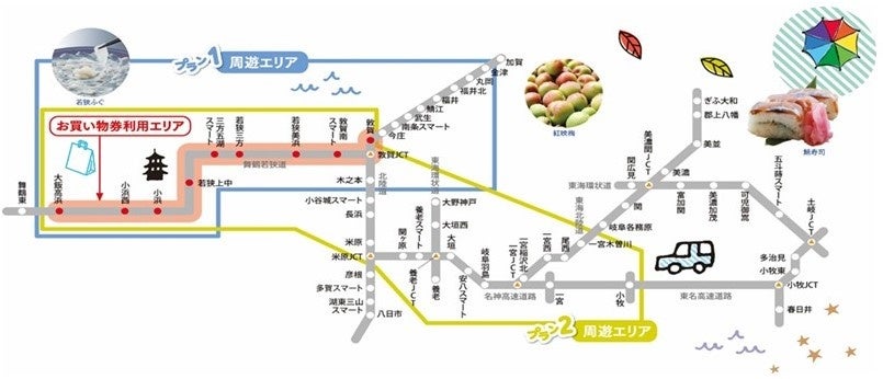 このドライブプランは、福井県嶺南地域の28カ所の観光施設などでお土産の購入や飲食などにご利用できる、「若狭路お買い物券」(通常支払額に2,000円分がプラスされた合計3,000円分のお買い物券)付きのセット商品です。ご利用方法によっては通常の高速道路料金より大変お得に旅行いただけます。