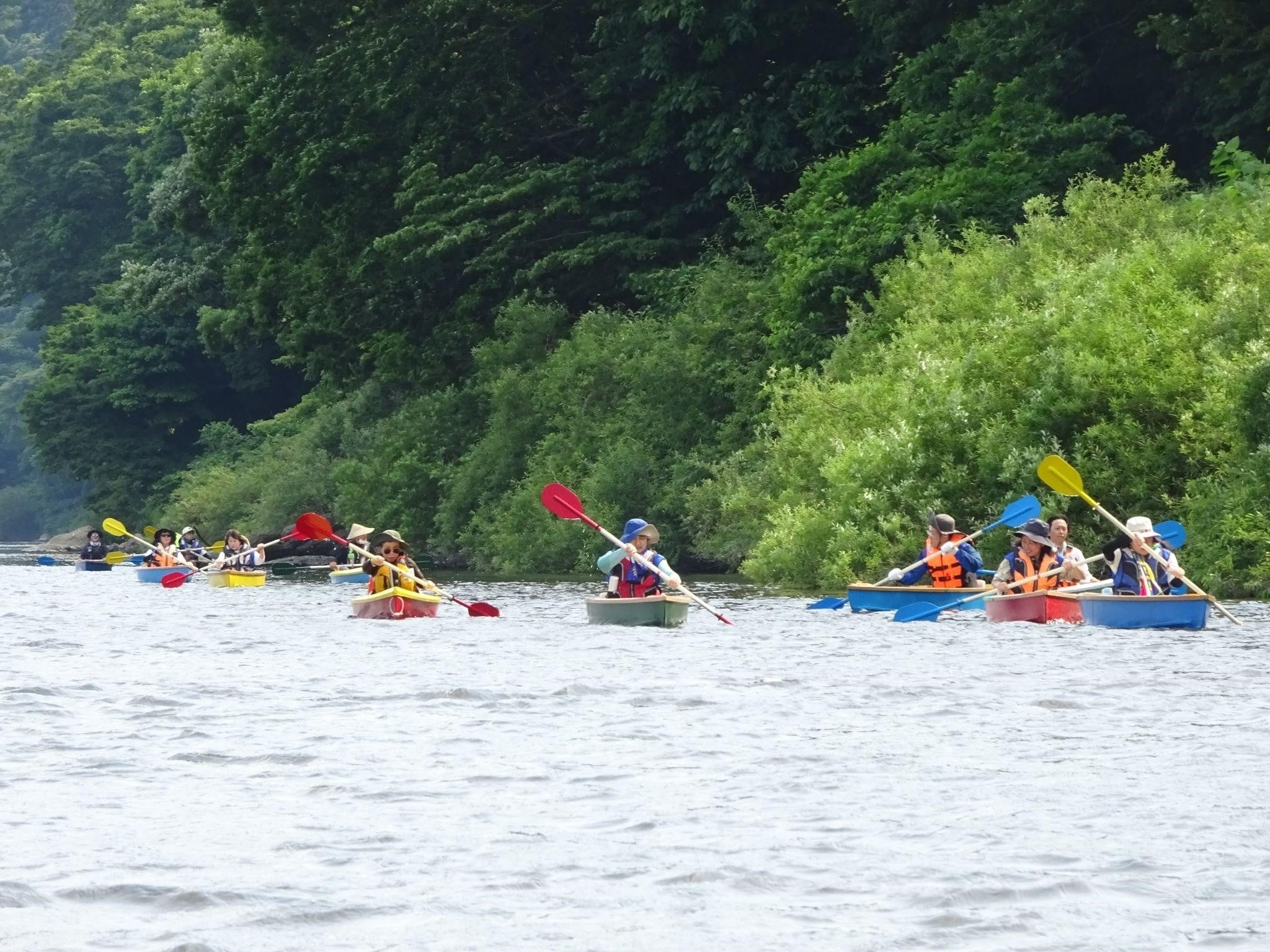 川沿い遊歩道のごみ拾いの後は、二ツ井観光協会指導員のサポートによるカヌーでの川下りを行いました。参加者たちは、いつもとは違った水上から見る二ツ井の美しい新緑まぶしい景色を堪能します。この日の川の水は少なめで、川岸の高い位置の枝にビニール紐やお菓子のパッケージなどのごみが絡みついているのがわかり、カヌーからも無理のない範囲で拾えるごみを回収しました。水面に目立つごみはそれ程多くはありませんでしたが、川の中をよく覗いてみると、カヌーでは回収困難なロープや缶、ペットボトルなどのごみが沈んでいることがわかりました。参加者は川にごみを流さない努力の大切さを再確認しました。