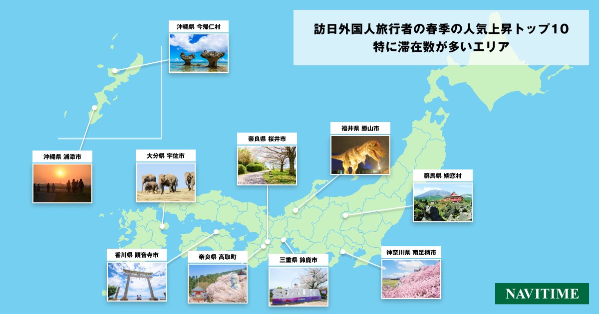 訪日外国人旅行者の関心と需要の高まりを踏まえ、ナビタイムジャパンが提供する訪日外国人向けの観光ナビゲーションアプリの利用状況から、春季に人気が上昇している市区町村を分析いたしました。