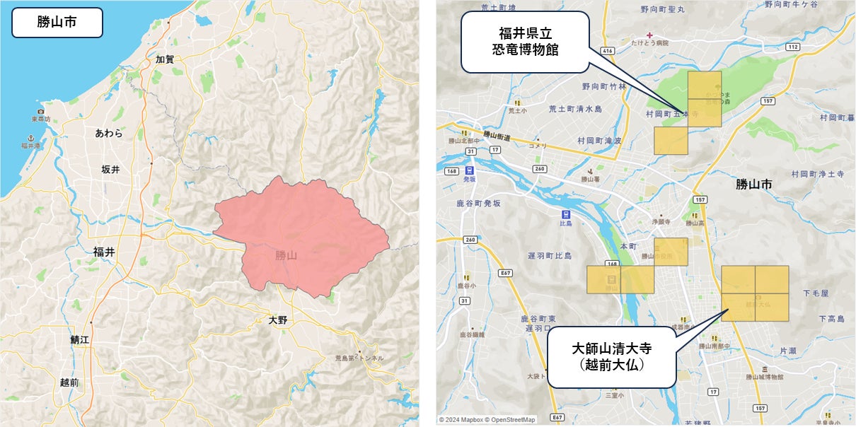 勝山市での滞在エリアを確認すると、福井県立恐竜博物館や、越前大仏で有名な大師山清大寺での滞在が多いことが確認できました。