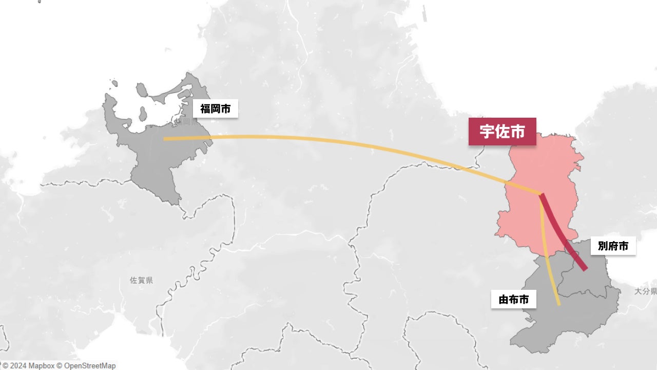 宇佐市を目的地とした移動の出発地からも、特に別府市からの来訪が多いことが確認できます。