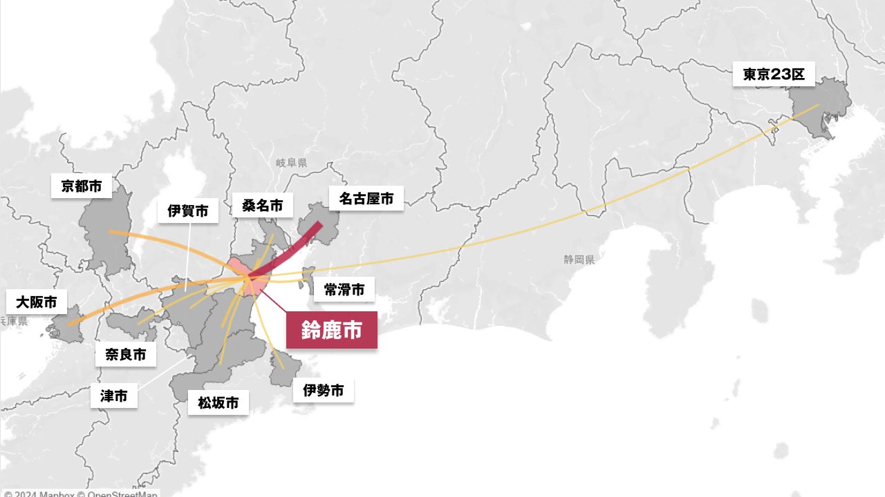 鈴鹿市の来訪者がどこから出発しているかを確認すると、特に名古屋で多くの滞在が確認でき、中部国際空港からのアクセスのよさ、鈴鹿サーキットへの臨時特急の運行などの利便性の高さが主な理由であると考えられます。