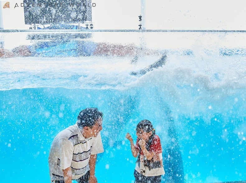 マリンライブ後半では、プール前に集まったゲストの目の前をイルカたちが大ジャンプ!&噴水から大量の水をプレゼント!猛暑を吹き飛ばす驚きの体験