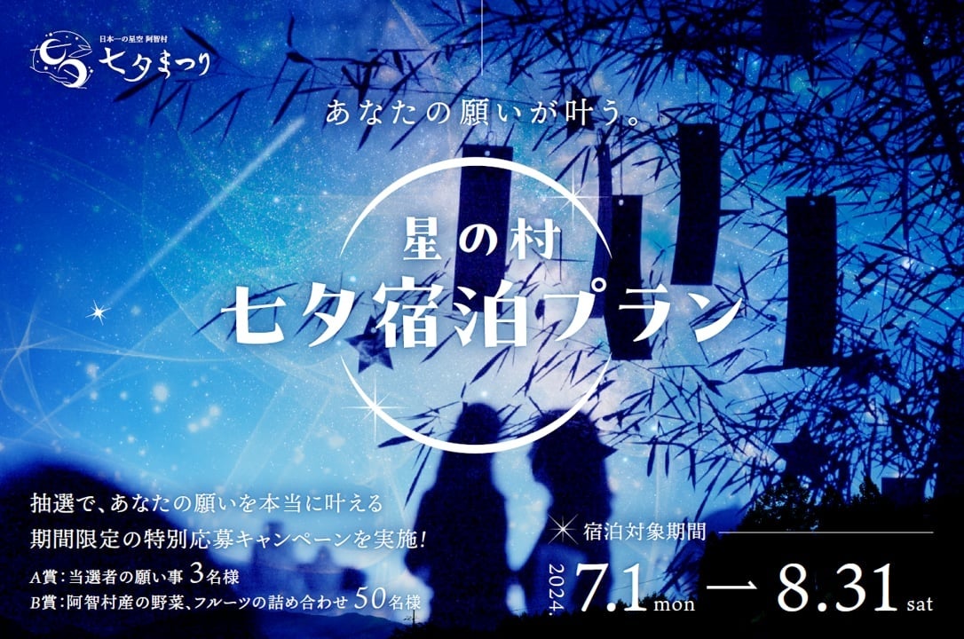 当プランを含めた「日本一の星空の村で願いが叶う!七夕プラン」に、ご宿泊・ご応募いただいた方から抽選で3名様の願いが叶います。さらに、50名様に阿智村の野菜・フルーツ詰め合わせセットがプレゼントされます。