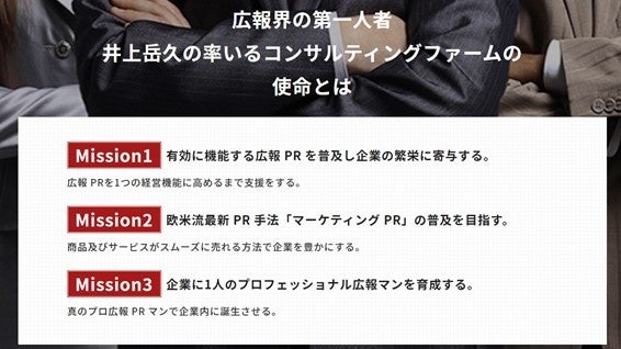 戦略広報の実践実務の第一人者で、トップ広報コンサルタントと称される井上岳久が率いるコンサルティングファームです。