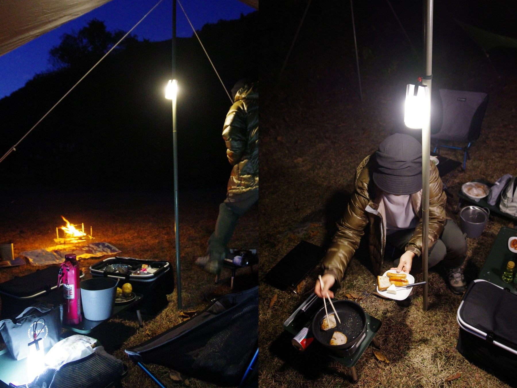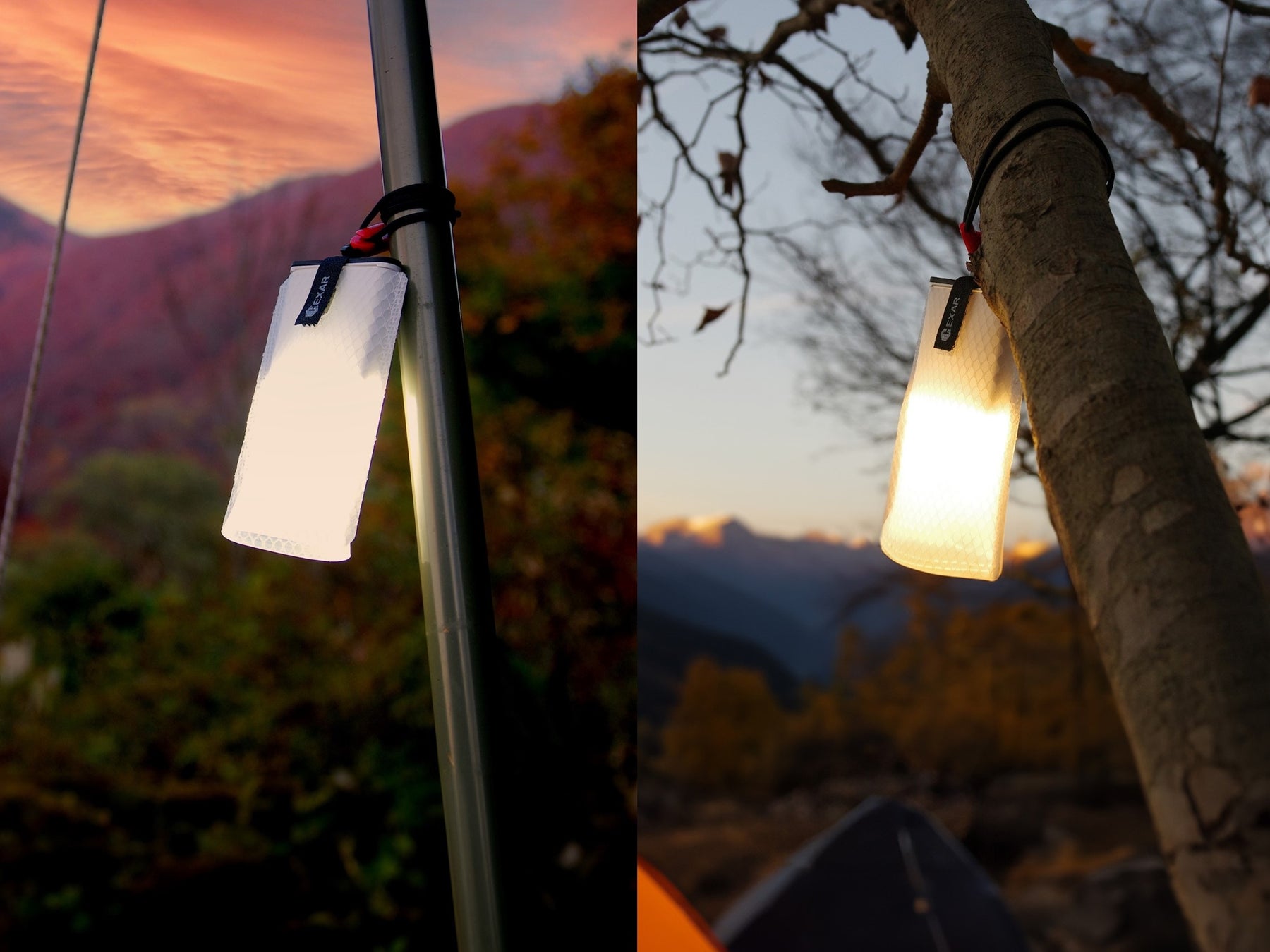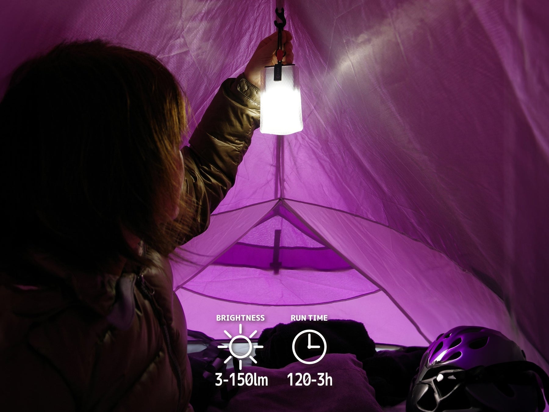 軽量ながら最大光束は150lmで、直下も明るく照らす広域配光は、テント泊や調理シーンで活躍します。無段階調光が可能で最小光束3lmでは最大120時間点灯が可能です。ポーチシェードは耐久性と柔軟性に優れるEVA素材を使用し、優しい光を放ちます。