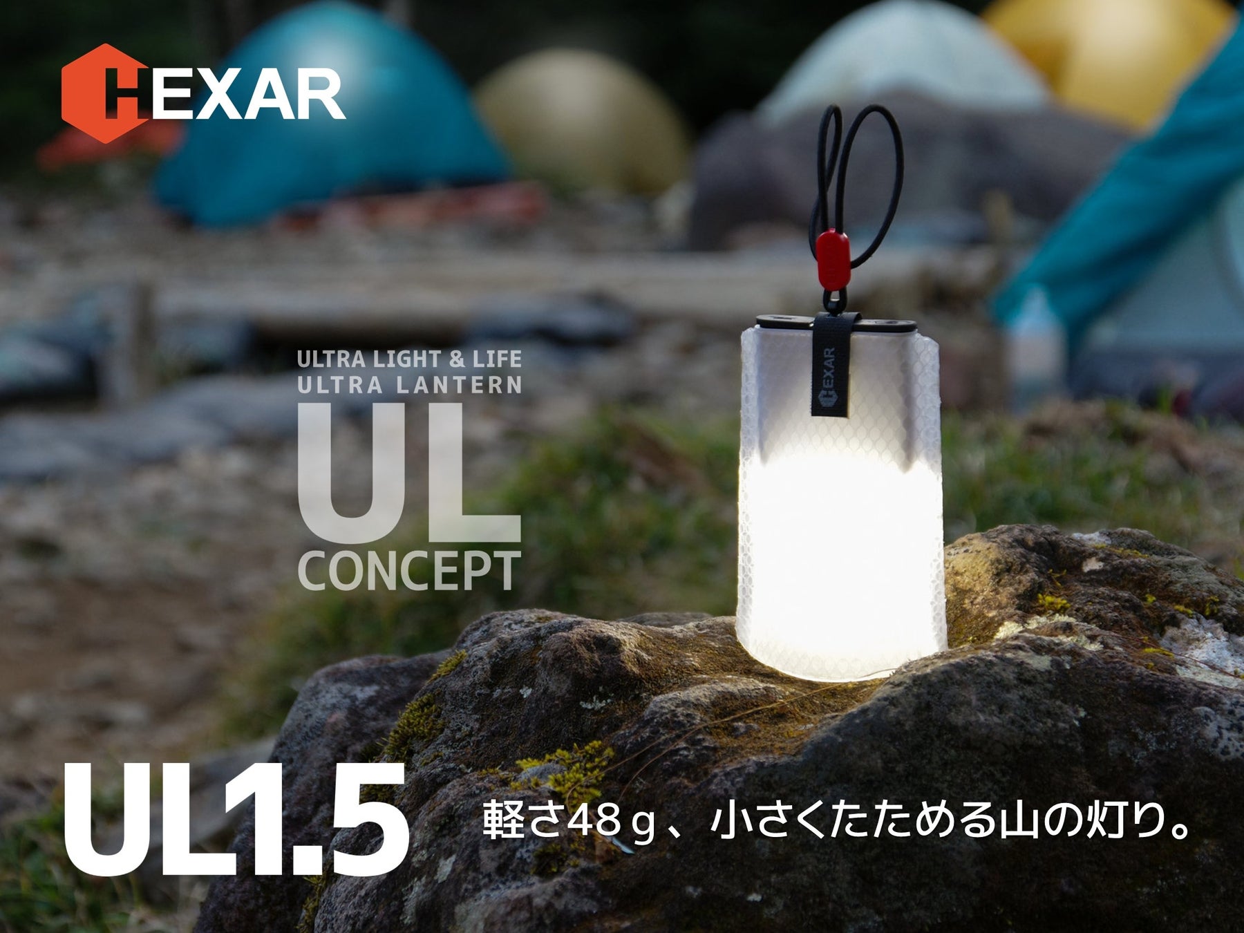 本製品はアウトドアシーンで活躍するアイテムを展開するHEXARブランドのLEDランタンです。同ブランドのUL(ウルトラライト)シリーズは、登山・ハイキングシーンで重要な「軽さ」を追求しました。本製品は既に発売している「UL3、UL4」「CL6」に続く4アイテム目、48gの軽さを実現し、テント泊登山・ソロキャンプシーンなど様々なシーンで活躍します。電球色のUL1.5L、昼白色のUL1.5Nと発光色の異なる2つのモデルを用意しました。
