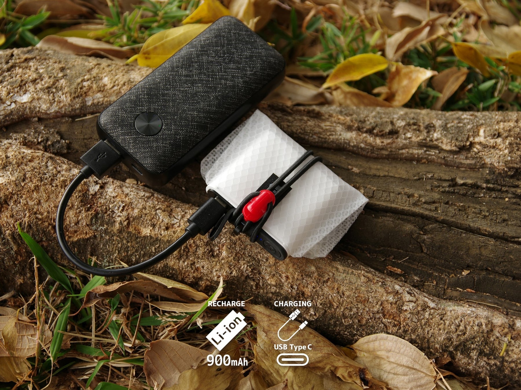 薄型リチウムイオン充電池 、900mAhのバッテリーを搭載。充電はスマートフォンでも標準のUSB Type CでType-A to C 充電ケーブルが付属します。