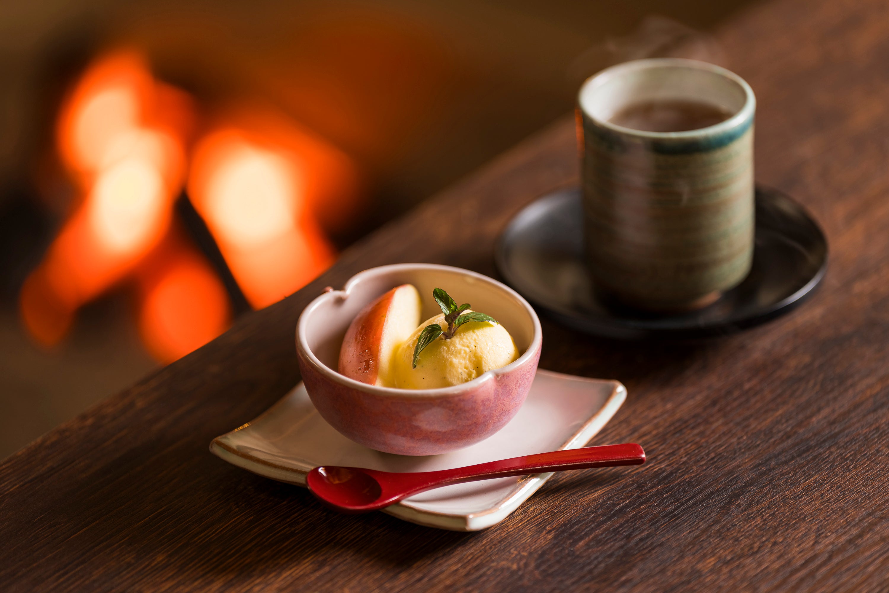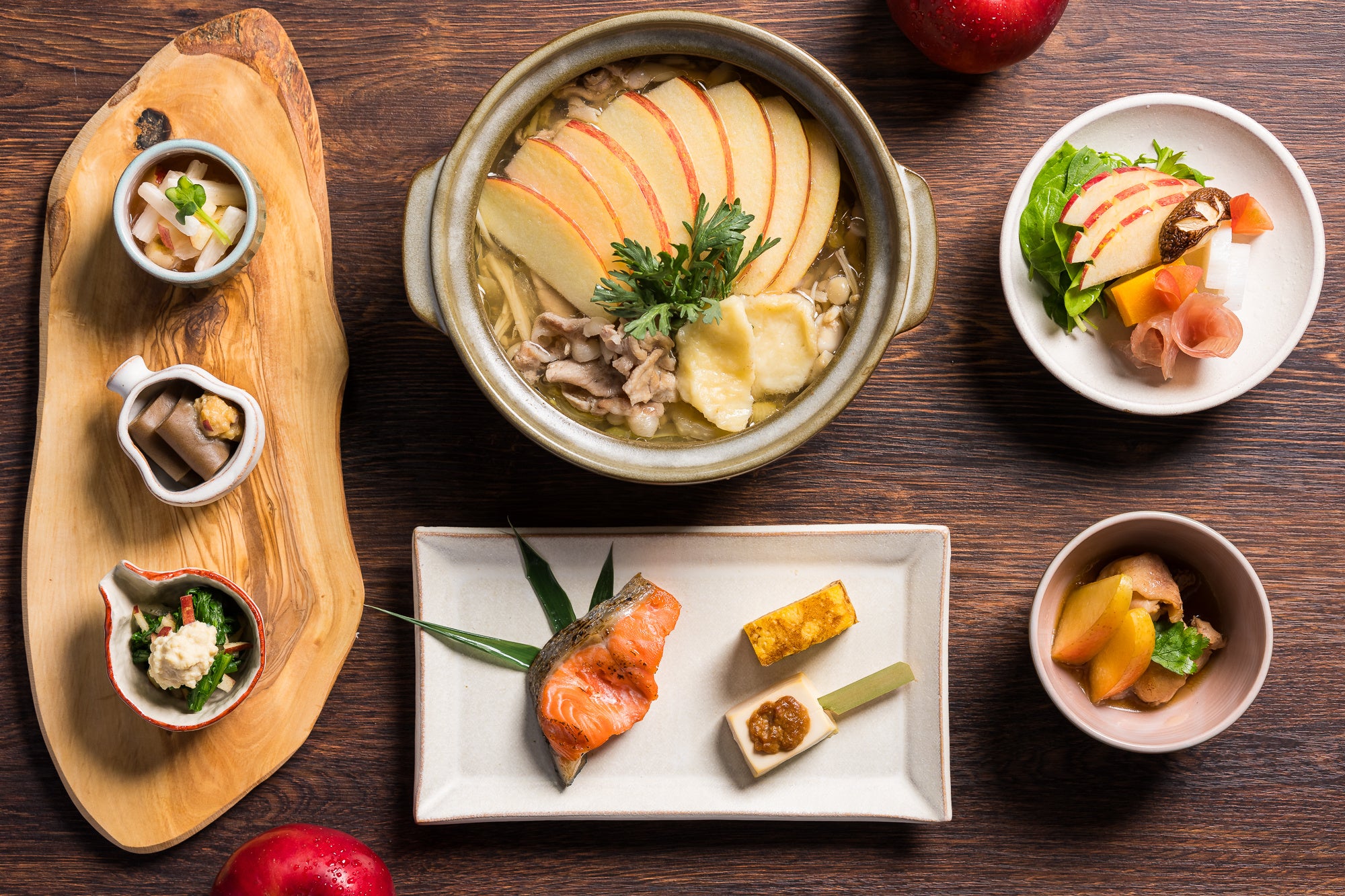 「シャキッとりんご朝食」では、りんごを使った料理とデザート計8品を用意します。メインの「りんご鍋」は味噌ベースのまろやかな味で、りんごのシャキシャキとした食感と甘みを楽しめるのが特徴です。その他、梅肉の酸味が効いた「りんごと長芋梅肉和え」や豆腐のさっぱりした味とりんご味噌の甘さを楽しめる「りんご味噌豆腐田楽」、野菜とりんごを楽しめる「りんごと生ハムのサラダ」なども味わえます。食後には、オーブンでじっくり焼いて甘みが増した焼きりんごにバニラアイスクリームを添えたデザートが堪能できます。りんご尽くしの料理で健やかな一日の始まりを感じられる、秋限定の特別な朝食です。