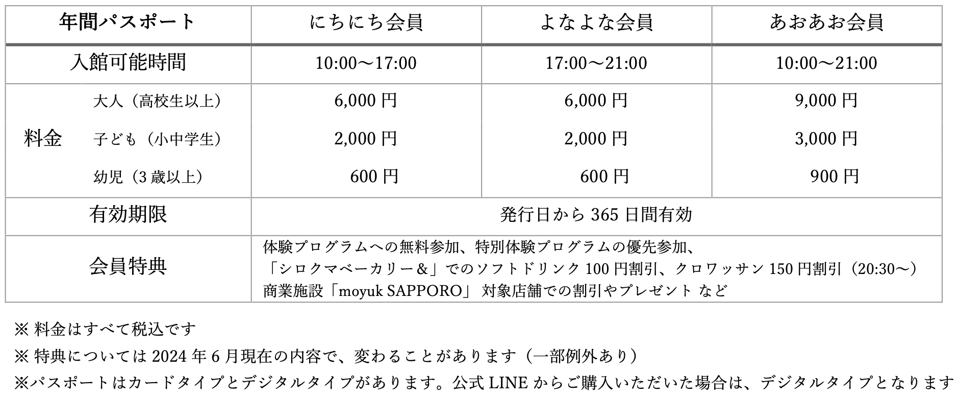 今回のリニューアルでは、多くのお客様から1年間有効のパスポートを要望するお声をいただいたことをうけて、これまでの会員制度を見直し、2024年7月1日(月)以降より、365日間通い放題の「年間パスポート」を発行します。新会員制度では、10:00〜17:00に入館可能な「にちにち会員」、17:00以降に入館可能な「よなよな会員」に加えて、終日入館可能な「あおあお会員」の3種類のパスポートを発行します。