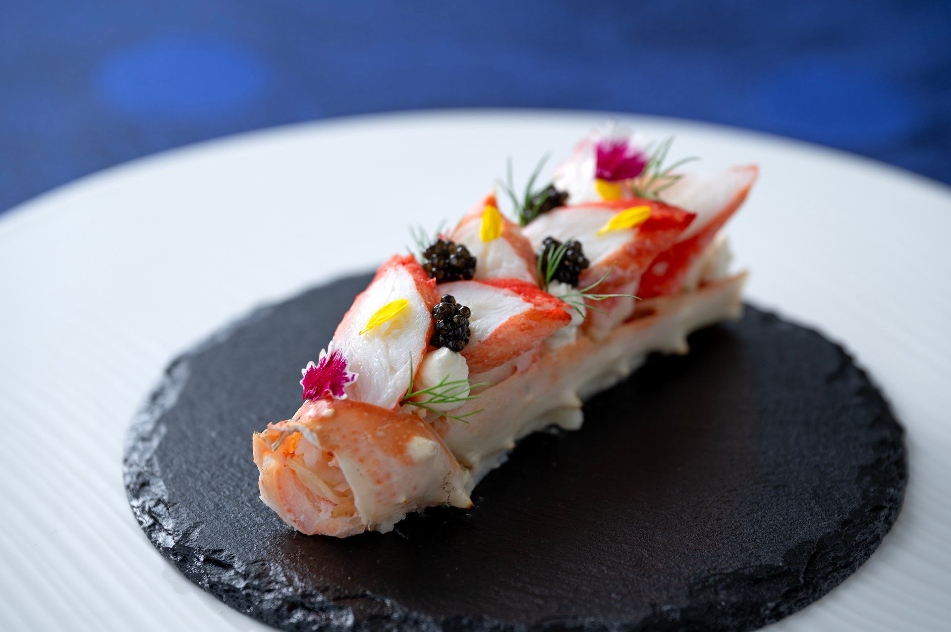 タラバガニとキャビアを贅沢に盛り付けた美しい一品など、丁寧に仕上げたフルコースをお楽しみください。
