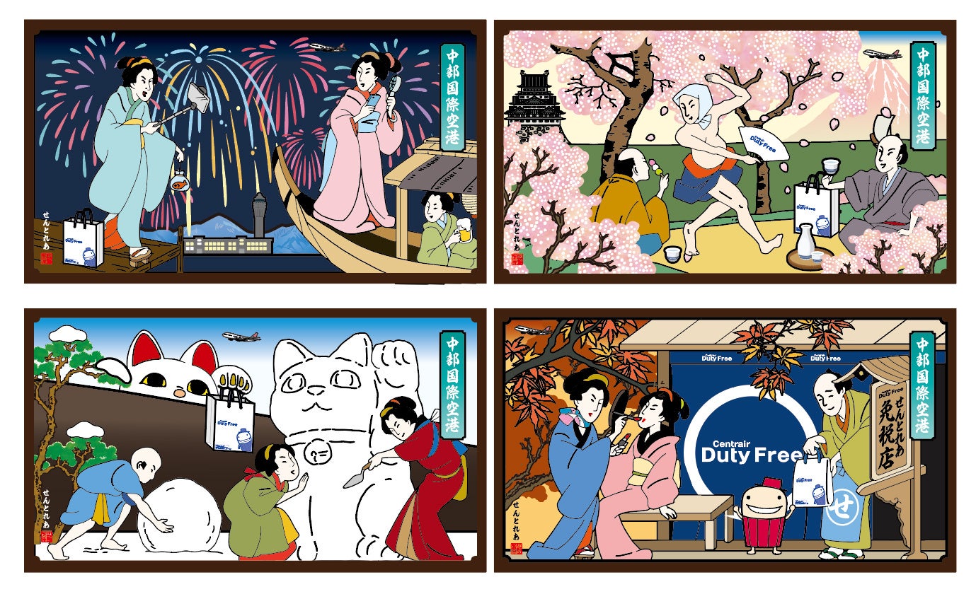 日本ならではの四季をテーマに、浮世絵風のタッチで日本らしさを前面に出すとともに、セントレア免税店のお買い物袋や、空港のある愛知県常滑市の名産品「招き猫」も紛れ込ませ、遊び心のあるデザインとなっております。