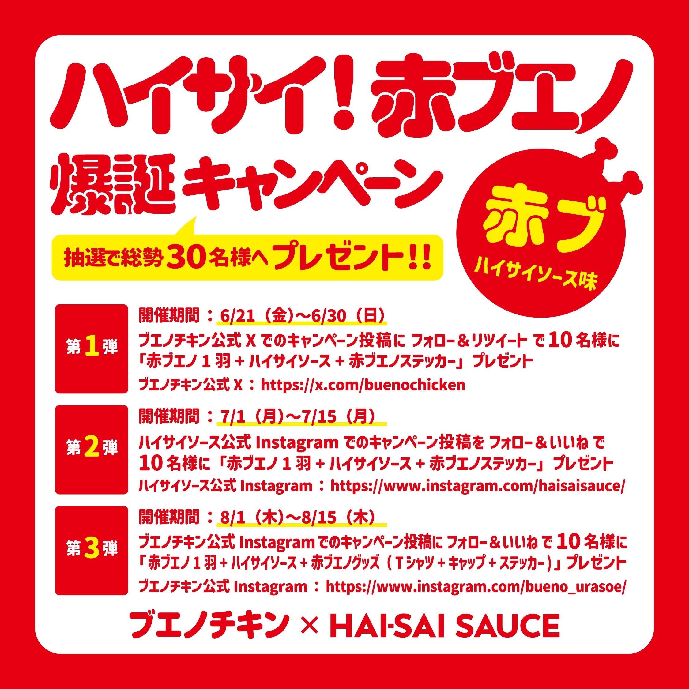 ブエノチキン公式X(https://x.com/buenochicken)を『フォロー』し、キャンペーン投稿を『リツイート』して頂いた方に「赤ブエノ1羽+ハイサイソース+赤ブエノステッカー」を抽選で10名様にプレゼントします。
