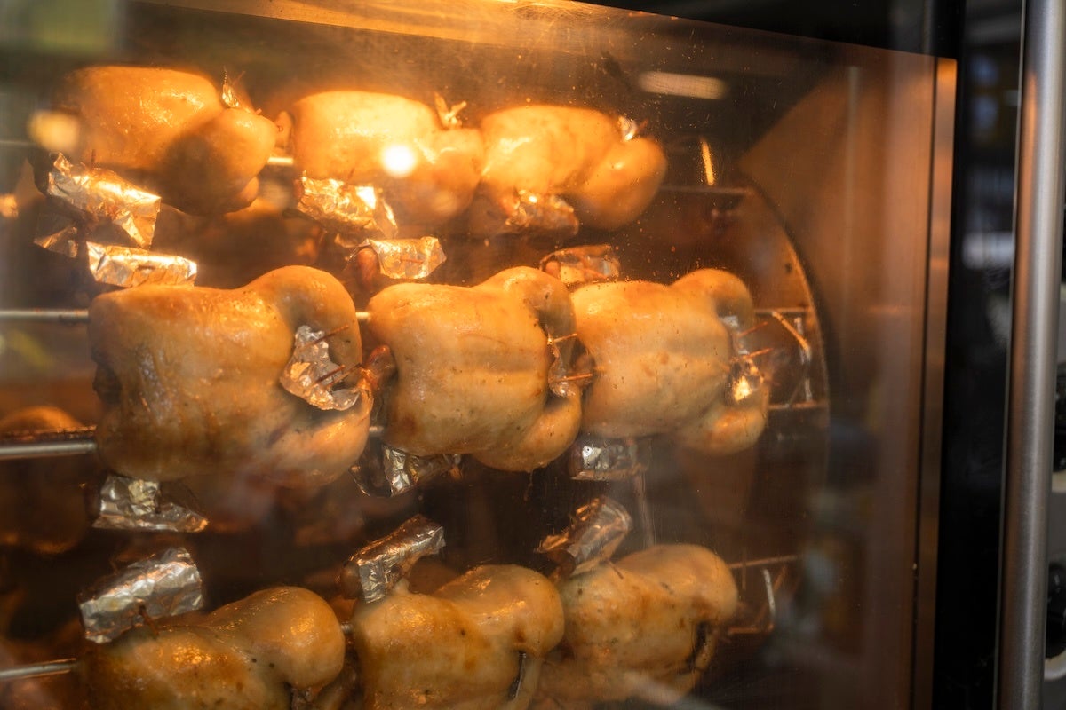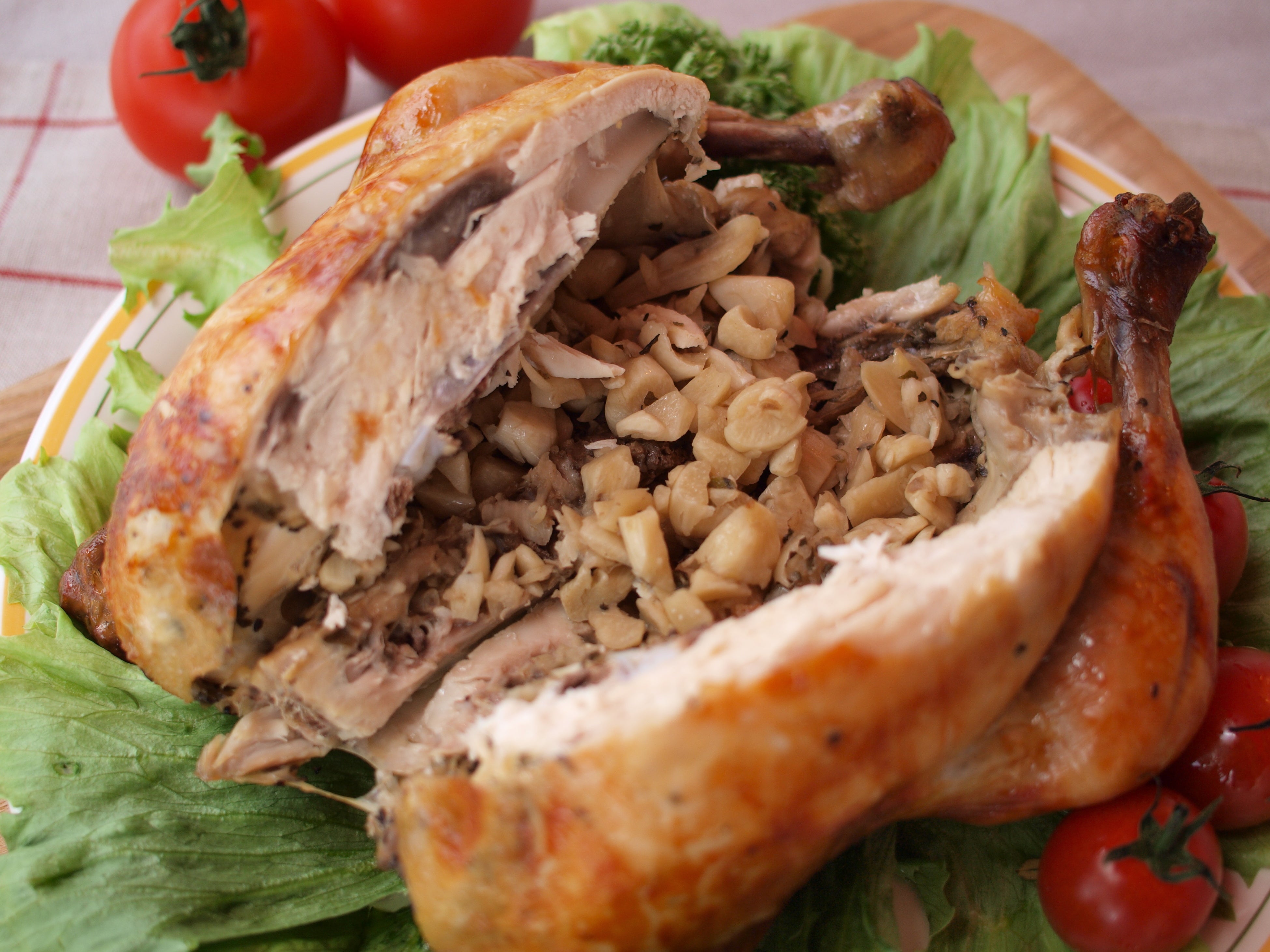 そもそも「ブエノチキン」とは、沖縄にある小さな店舗が作る鶏の丸焼き。にんにく、お酢たっぷり秘伝のタレに漬け込んだ新鮮な沖縄県産若鶏を専用ロースターでじっくり焼き上げた沖縄独特の料理です。秘伝のタレに入っていたニンニクも鶏肉のお腹の中に詰め込んで一緒に焼いているため、鶏肉とニンニクの旨味が融合し、でーじな(すごく)美味しさに仕上がっトリます!