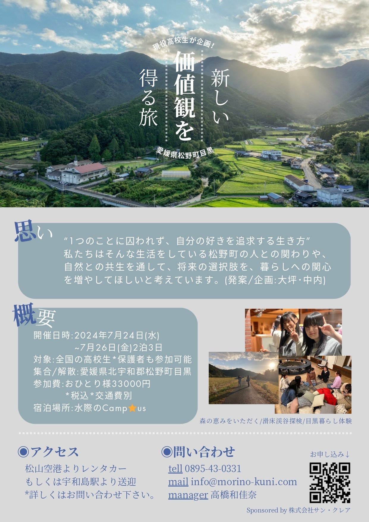 私たちは学校の取り組みの一環で愛媛県松野町と出会い、この地でしかできないことを沢山経験し、普段とは違う暮らしの形を知ることでさらに世界が広がるきっかけになりました。自然と人が深く関わりあうまちで、様々なコミュニティとまちとの関わり方や、他の地域とは違った暮らしの形を知り、普段の生活では経験できないようなことを肌で感じました。この体験を元に私たちが感じたことや学んだことを、より多くの人に感じてほしいと思い、ツアー企画に至りました。特に、人生の岐路に立っている高校生の皆さんには、松野町の暮らしを通して将来の選択肢を増やすきっかけにしてもらいたいと思っています。自然と人にふれ、新しい価値観を得る旅で皆さんをお待ちしています!