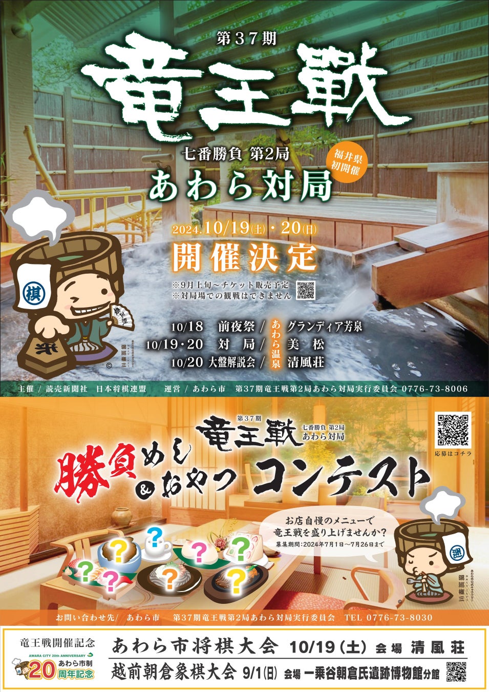 令和6年10月19日(土)・20日(日)、本市の「あわら温泉 美松」を会場に、第37期竜王戦七番勝負第2局あわら対局(主催:読売新聞社、日本将棋連盟)が行われます。
