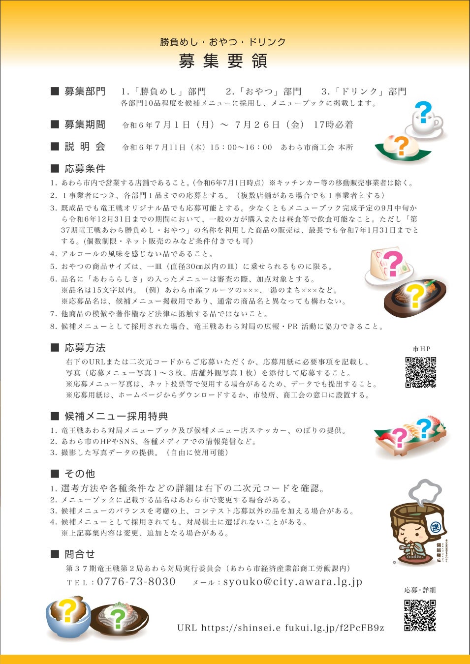 この対局にあわせ、全国から注目される対局時の「勝負めし」などの提供メニューについて、公募コンテストを実施します。