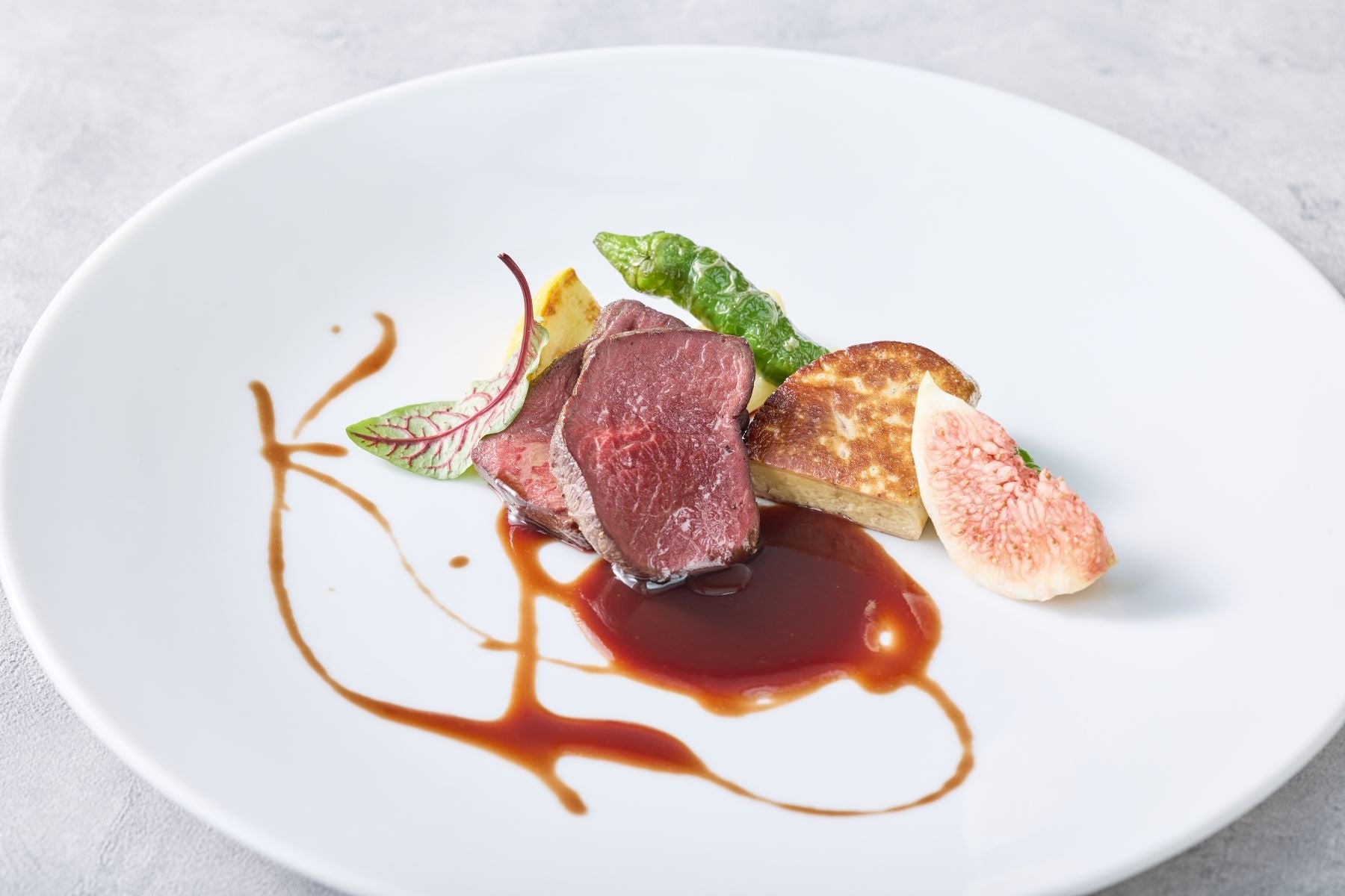 夏鹿のローストとフォアグラのポワレ ポワブラードソース 愛知県産無花果を添えて