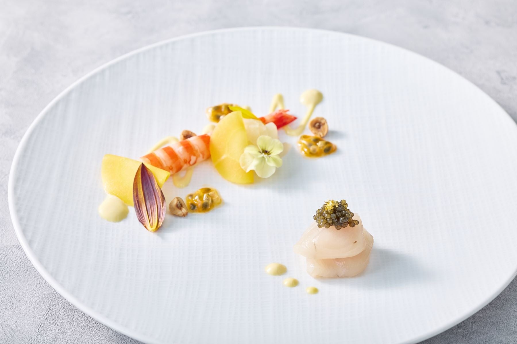 オシェトラキャビアと三重県産カンパチのカルパッチョ 車海老のポシェとアンディーブと黄人参のマリネ