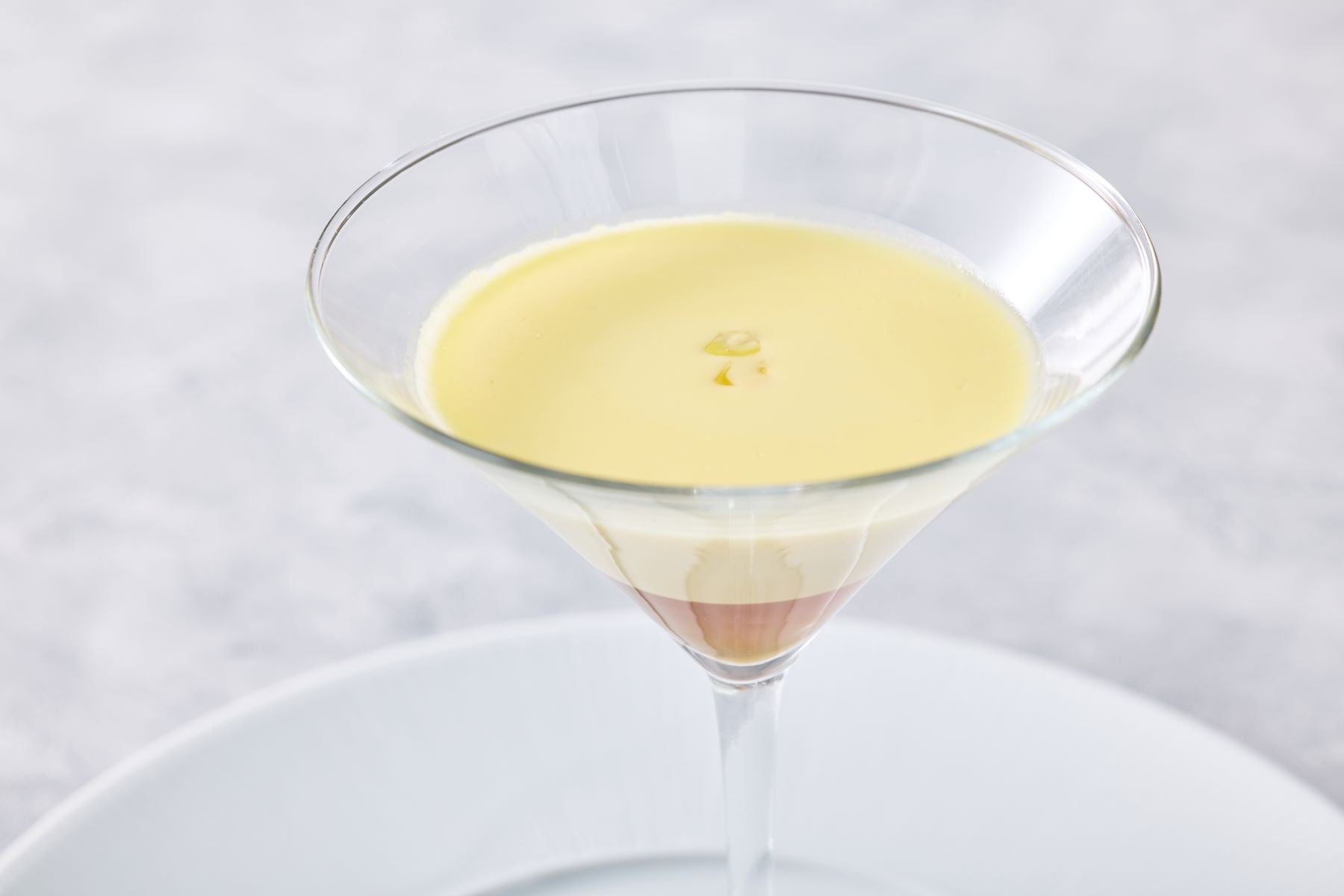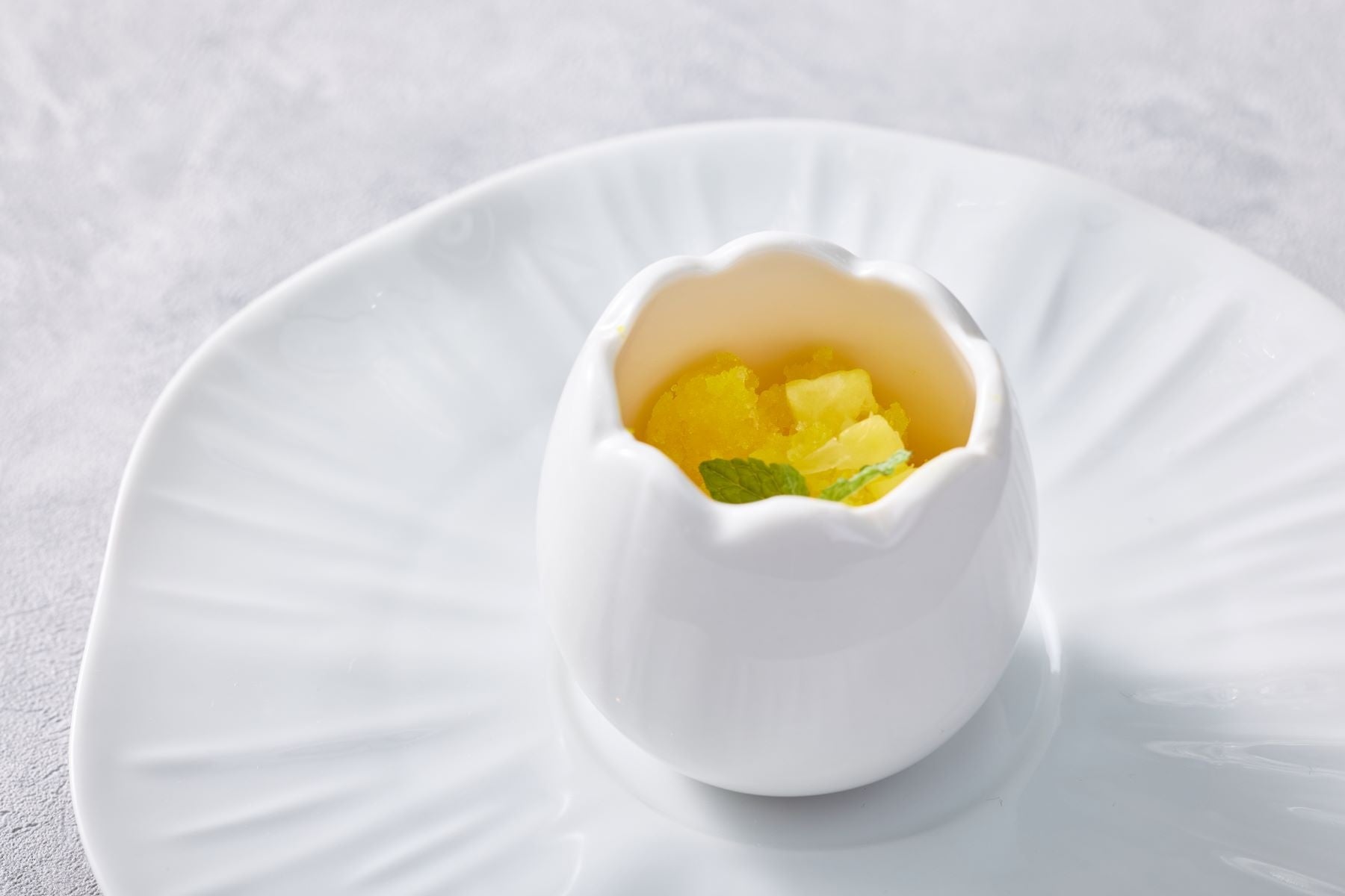 愛知県田原産とうもろこしの冷製スープ 完熟トマトのソルベとコンソメのジュレ