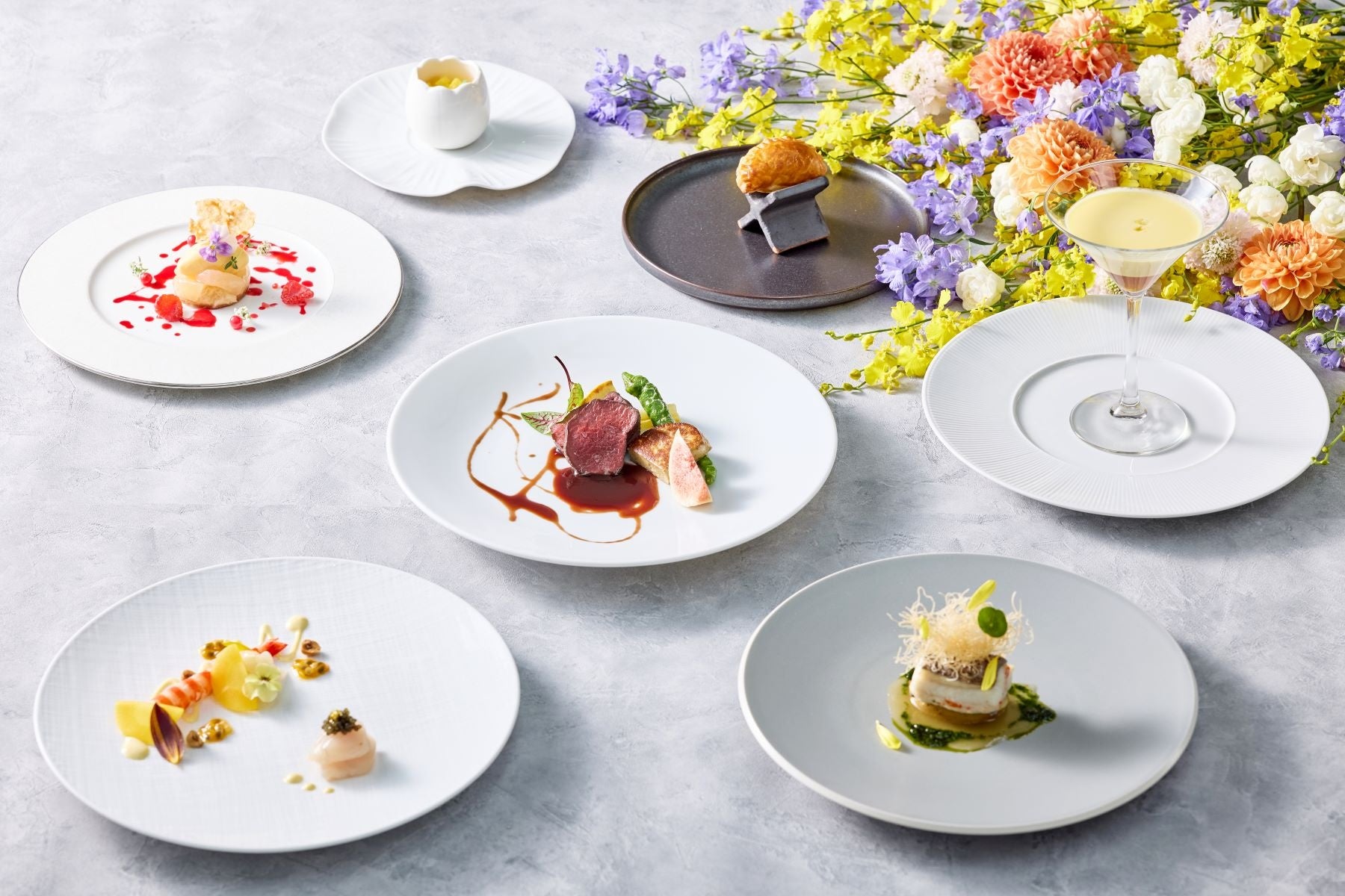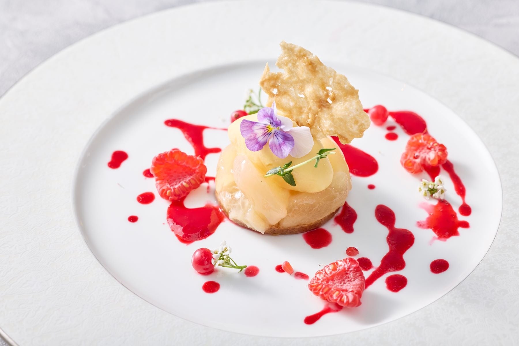 シェフのこだわりが詰まった本コースは、キャビアや向日葵の花が添えられた三重県産カンパチのカルパッチョ、とうもろこしやトマトを使用した2層仕立ての冷製スープ、太刀魚とズワイガニを使用した魚料理、フォアグラのポワレと一緒にお召し上がりいただく夏鹿のローストなど、色彩豊かで食材を活かした繊細な味とテクスチャーが特徴。デザートには、旬の桃をふんだんに使用した、目にも美味しいピーチメルバをご用意。