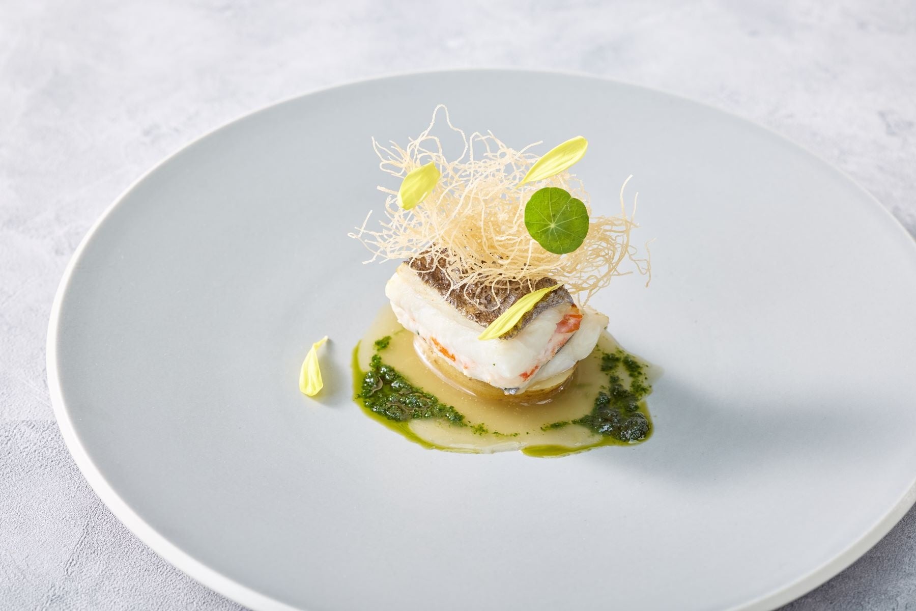太刀魚とズワイガニのムースのミルフィーユ フュメ・ド・ポワソンとサルサヴェルデをソースとして