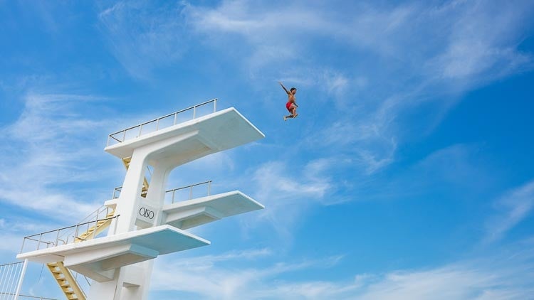 ダイビングプール。10mの飛び込み台から見る景色は開放感満点!