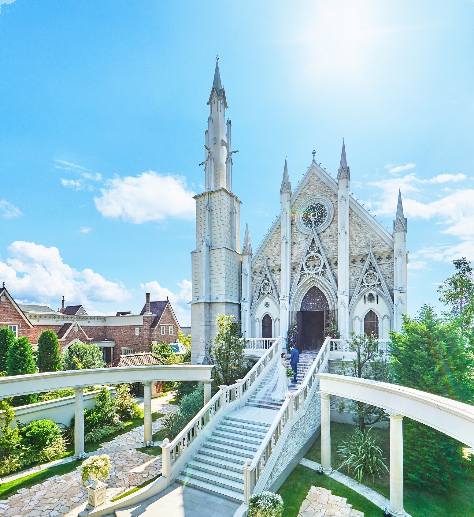 イギリス・ヨークの美しい街並を再現した敷地内はまるで映画の世界のよう。本格大聖堂のような独立型チャペル、披露宴会場、充実の付帯設備を完備。披露宴会場は、ガラス細工を施した天井にシャンデリアが輝く優雅な邸宅(170名収容)と、ウッディなインテリアや天窓などナチュラルな魅力に満ちた白亜の邸宅(120名収容)の2つ。共に専用ガーデン付きで、デザートビュッフェや花火、人前式も可能。料理・美容・衣装・装花・映像といった専門職を内製化し、質の高いサービスを提供。
