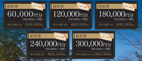 宿泊券の種類は「6万円<20万円の寄付>」「12万円<40万円の寄付>」「18万円<60万円の寄付>」「24万円<80万円の寄付>」「30万円<100万円の寄付>」と全部で5種類。組み合わせでのご利用なども可能。