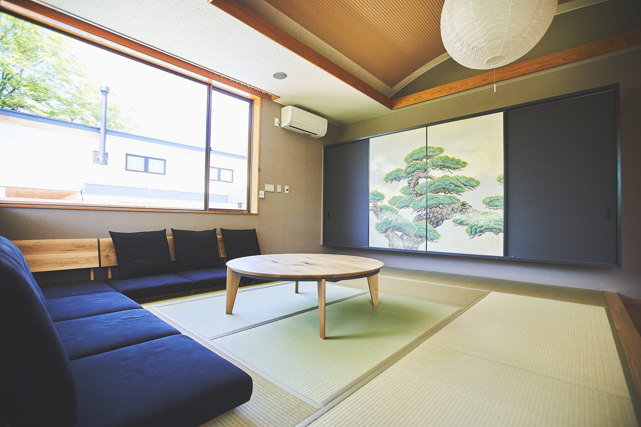 敷地内、多目的スペースの入口には、和室リビングとカラオケを設けました。印象的な松の襖を開けると大型テレビがあり、畳の上でおくつろぎ頂けます。心地よいイ草の香りに包まれながら大の字でごろ寝もよし、冬は炬燵になる大きなテーブルでみかんを食べながらトランプに興じるもよし、カラオケで大いに発散するもよし、第二のリビングとしてご自由にお楽しみください。