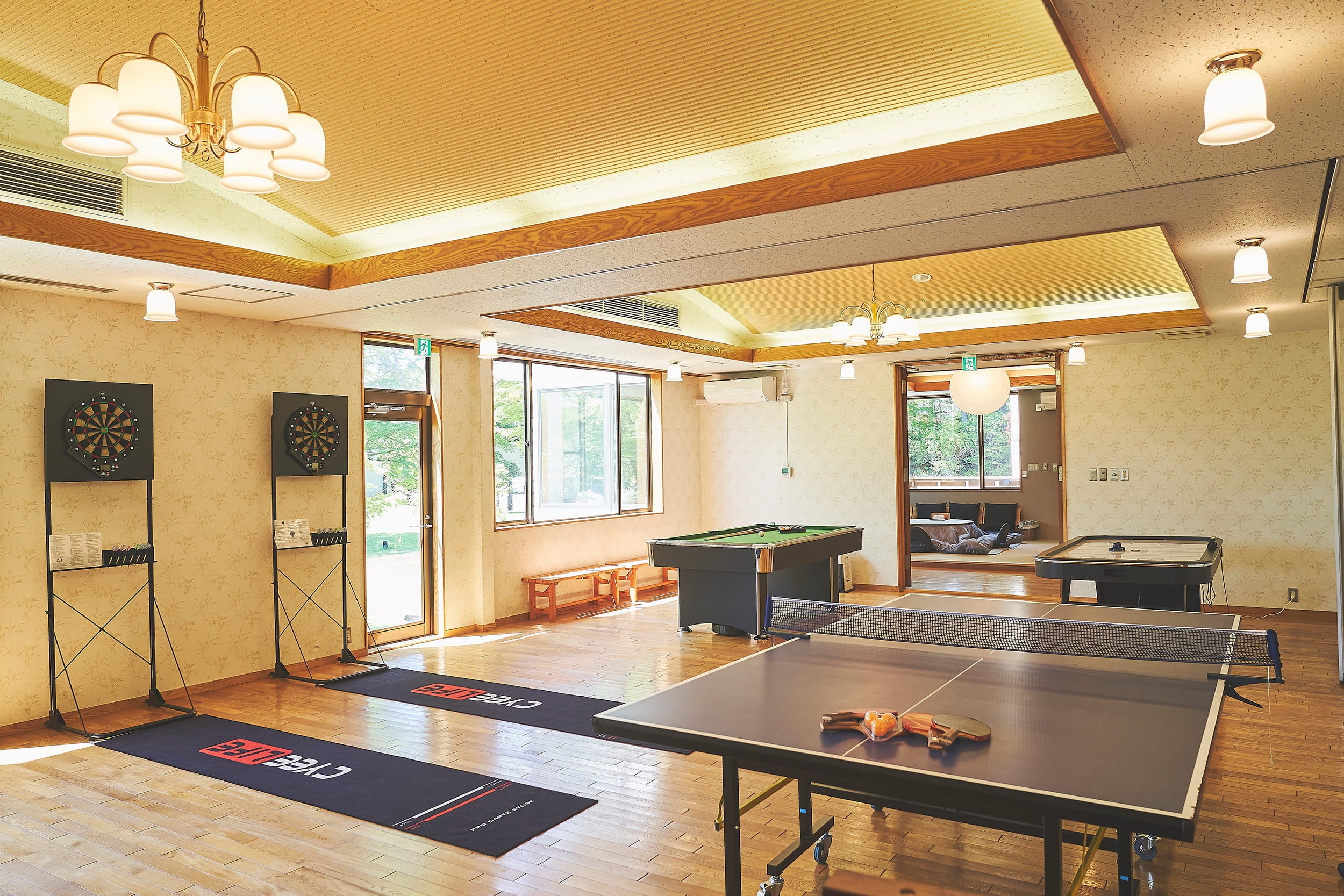 会議など打合せにご利用頂ける多目的スペースに、アミューズメントコーナーを設置!卓球・ビリヤード・エアホッケー・ダーツなど本格仕様なものばかり!雨天や荒天時にも滞在をお楽しみ頂けます。